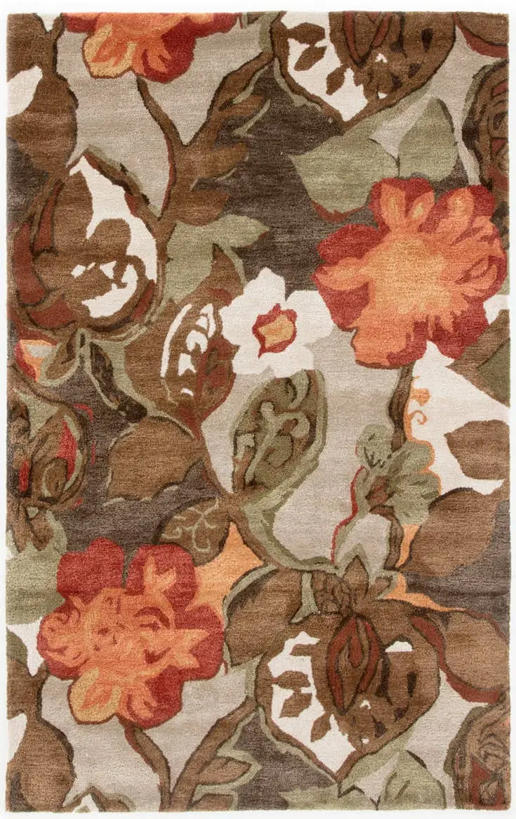 This hand-tufted area rug delivers artistic charm with rich and moody hues. Watercolor blooms in green, brown, orange, and red create a large-scale design on the light gray backdrop, while the wool and viscose blend lends a sumptuous feel underfoot.
