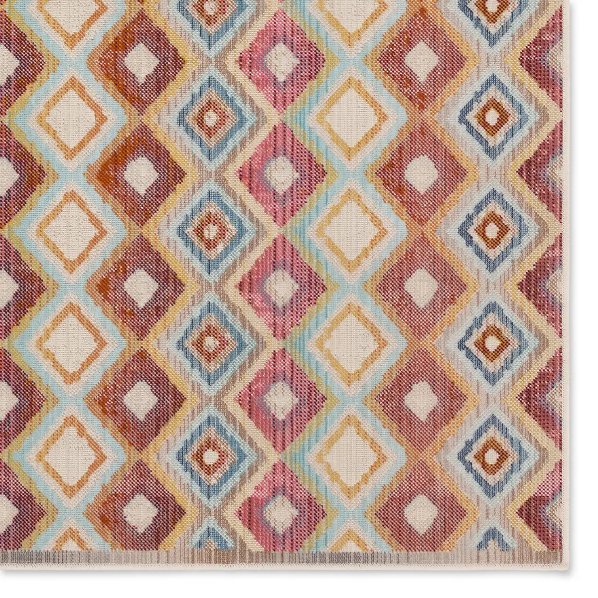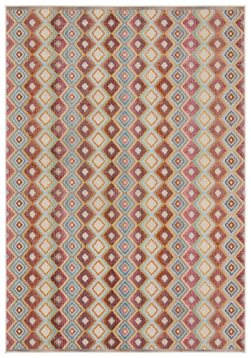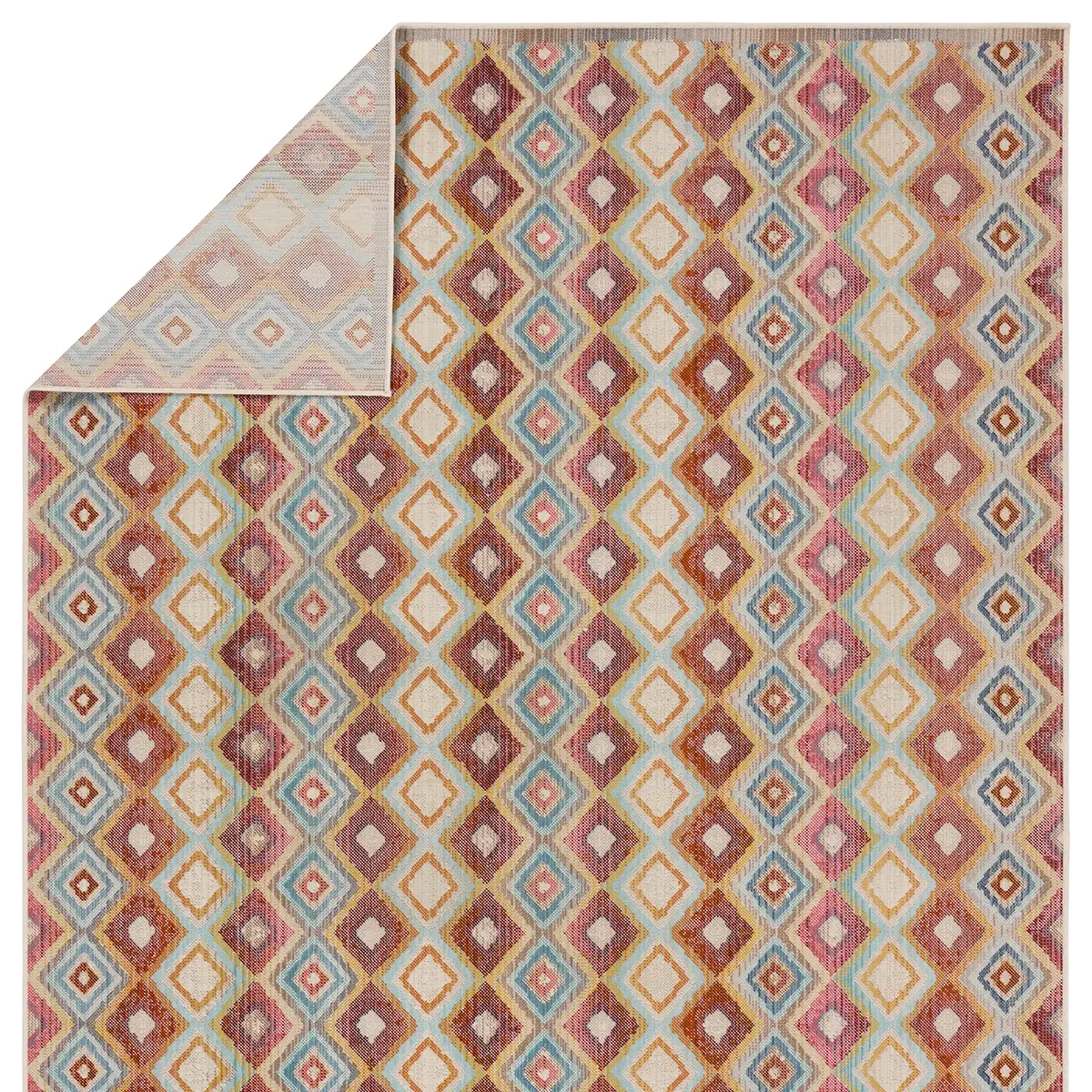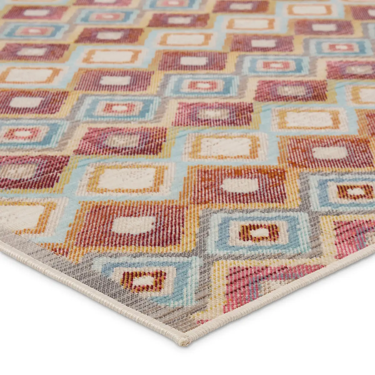 The beautifully colored BEQDIR collection features global inspired patterns and unmatched vibrancy. This assortment of power-loomed rugs features stunning dimension and creates a perfectly unique look that is durable for use in both outdoor and indoor spaces. The design showcases a tile design in hues of blue, brick red, pink, yellow, orange, cream, and taupe. This rug suits both high and low traffic areas of the home, from bedrooms to living rooms.
