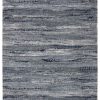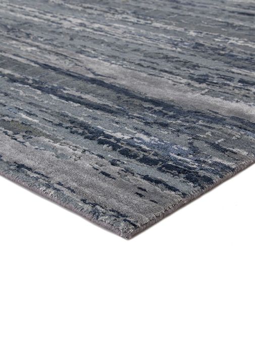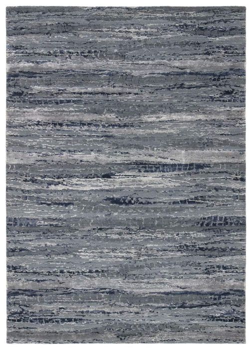 Hand-knotted of hand-carded wool and lustrous rayon made from bamboo, this area rug’s organic-inspired pattern captivates with abstract intrigue. Striations of dark blue, gray, and black form a midnight sky palette, perfect for modern homes.
