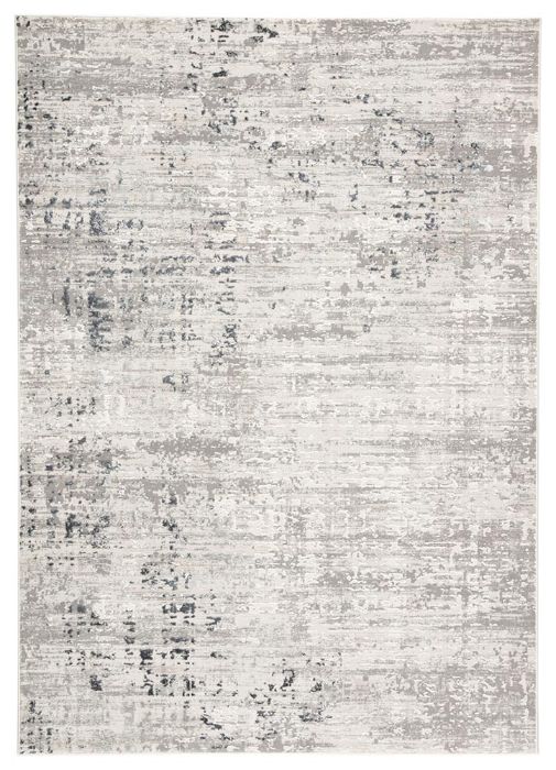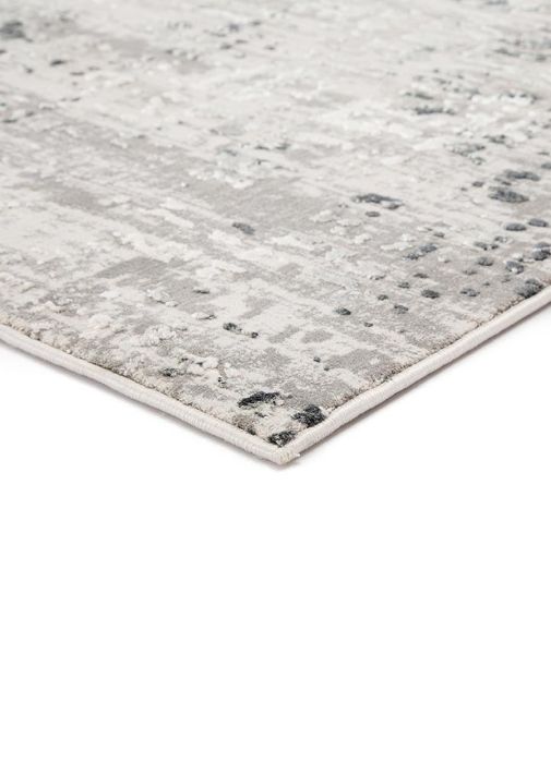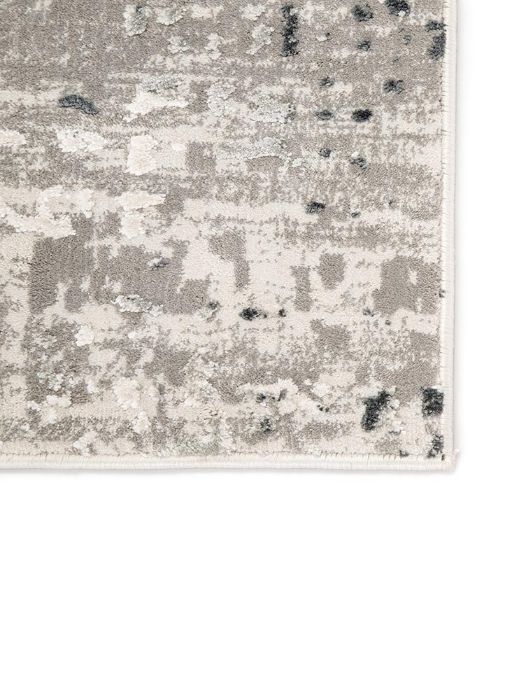 An abstract design in neutral tones. This power-loomed viscose and polyester accent’s stunning carved effect and subtle sheen capture light beautifully, highlighting the mottles charcoal, silver, and white hues.