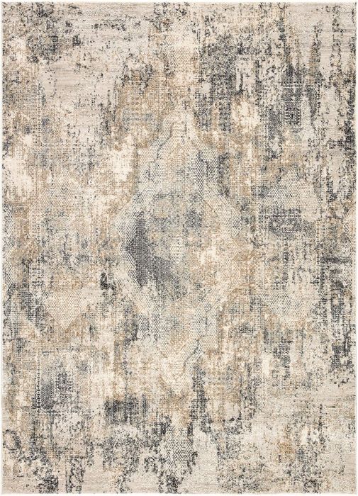 This area rug features fine details that create a broken medallion pattern. The mottled gray, ivory, and gold colorway of this power-loomed viscose and polyester accent effortlessly blends vintage and modern vibes.