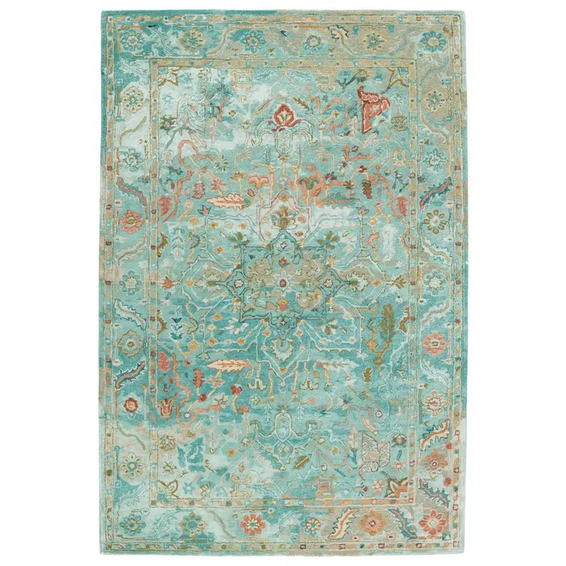 The CITDIR collection is an assortment of distressed Old World patterns reinterpreted for modern design. The hand-tufted rug showcases a center starburst medallion, accented by striking and vibrant hues of turquoise, olive green, pink, and gold. Made of viscose and wool, this timeless rug boasts an ultra-soft feel and elegant, subtle sheen.