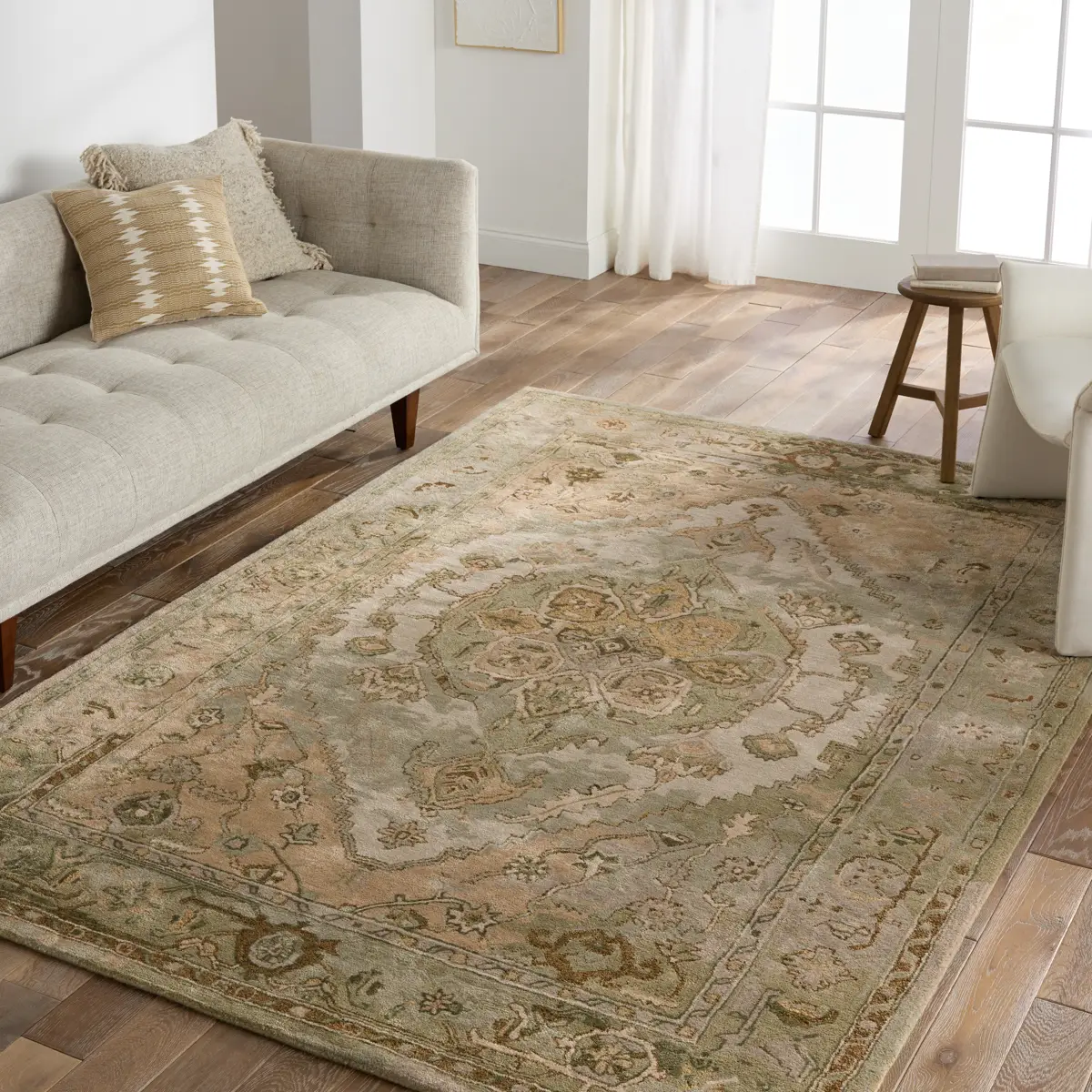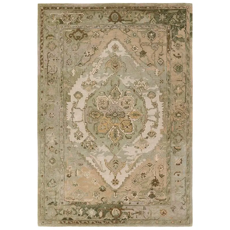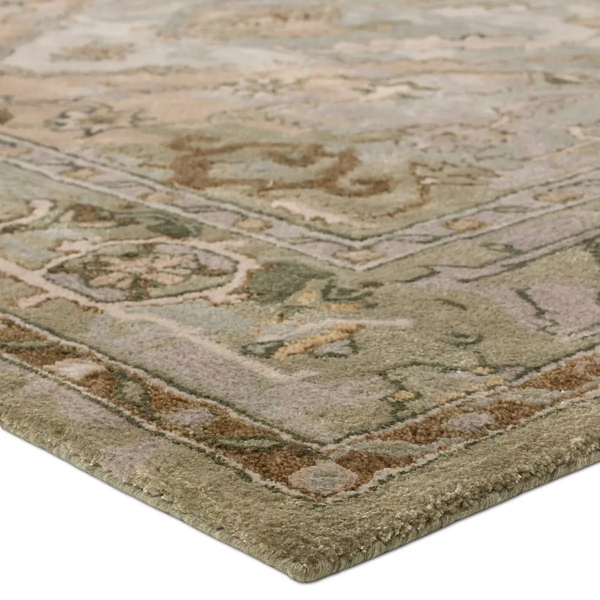 This collection is an assortment of distressed Old World patterns reinterpreted for modern design. The hand-tufted rug features an antiqued center medallion in elegant, neutral hues of greens, taupe, beige, and cream. Made of wool and viscose, this timeless rug boasts an ultra-soft feel and elegant sheen. The plush material best suits low traffic spaces of the home, such as bedrooms, formal dining areas, formal living rooms, and sitting rooms.