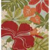 This playful indoor or outdoor area rug showcases a contemporary design and coastal-inspired hues. Vibrant beach botanicals create a graphic statement on the light blue backdrop for a bold dose of coastal style, while the looped pile lends unexpected texture to this durable layer.