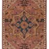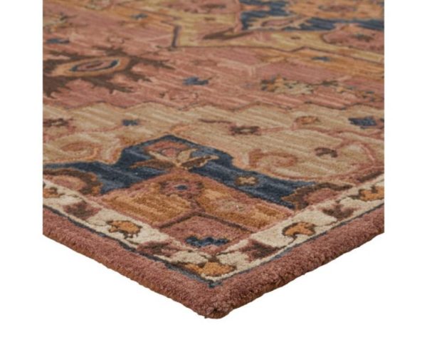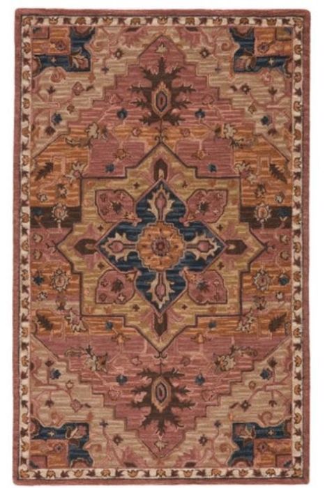 This hand-tufted collection boasts vivid jewel tones and uniquely distressed Turkish motifs, crafted to emulate traditional sun-faded, vintage designs. Showcasing  a stunning medallion motif in a rich color palette of dusty pink, gold, brown, and deep blue. Inspired by the artistic imperfection of dye-lot changes in perfectly aged wool textiles, the looped pile of this rug features tonal colorway depth and textural dimension.