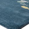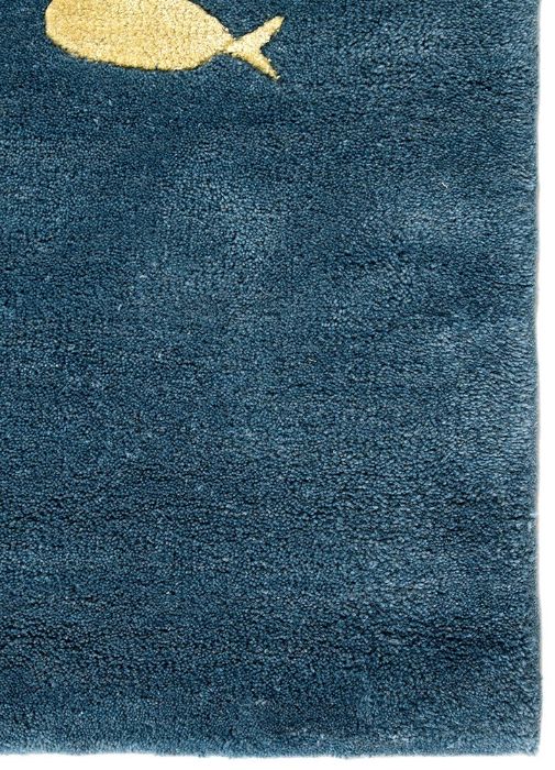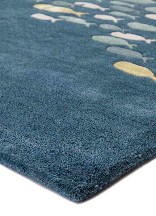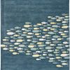 This playful hand-tufted area rug showcases a contemporary design and cool-toned coastal hues. A school of white, seafoam, and yellow-green fish swim whimsically on a deep blue wool and viscose backdrop.