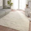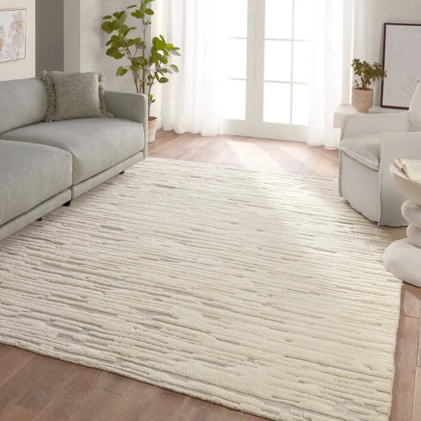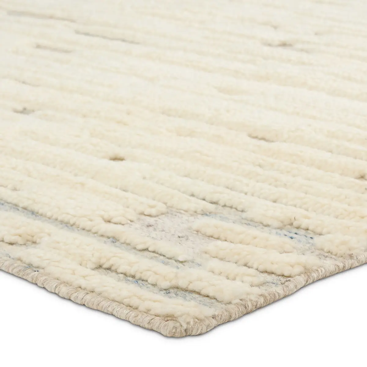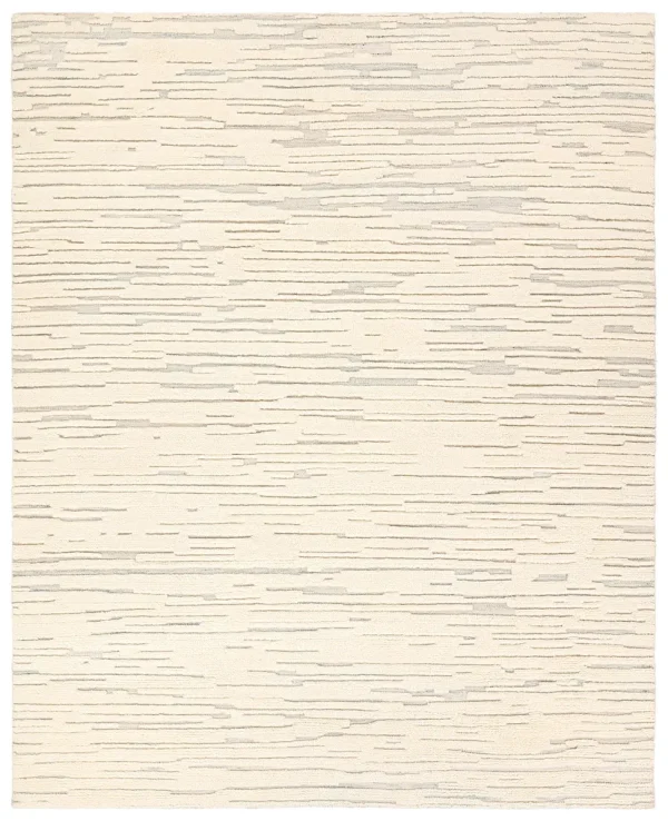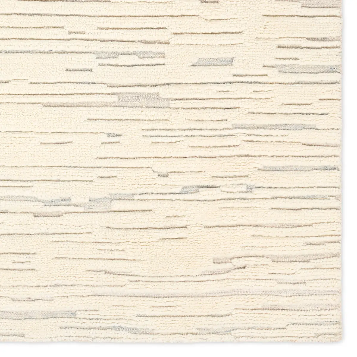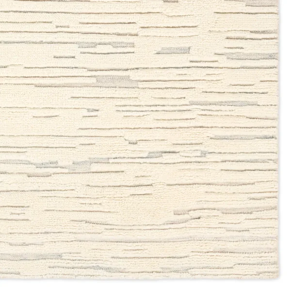 This hand-knotted collection showcases rich texture and grounding neutral tones in a variety of modern designs. The design features a striated look due to high and low levels of pile in cream, gray, and tan hues. The soft, 100% wool make is naturally stain and water resistant. Soft loops provide texture and comfort underfoot. This piece best suits low traffic spaces pf the home such as bedrooms, formal living rooms, formal dining areas, and sitting rooms.