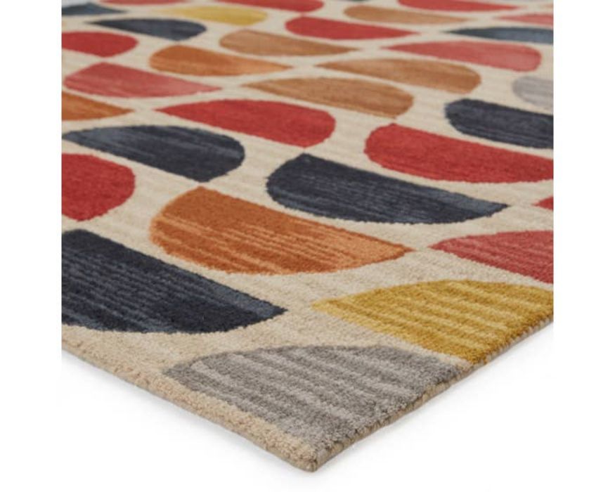 The ultra-mod and perfectly geometric collection infuses interiors with bold patterns and rich color schemes. An eclectic design and vibrant multicolor scheme come together to form this rug’s dynamic appeal. Hand tufted of wool, this retro-inspired rug boasts cushioned looped pile for an indulgent texture underfoot.