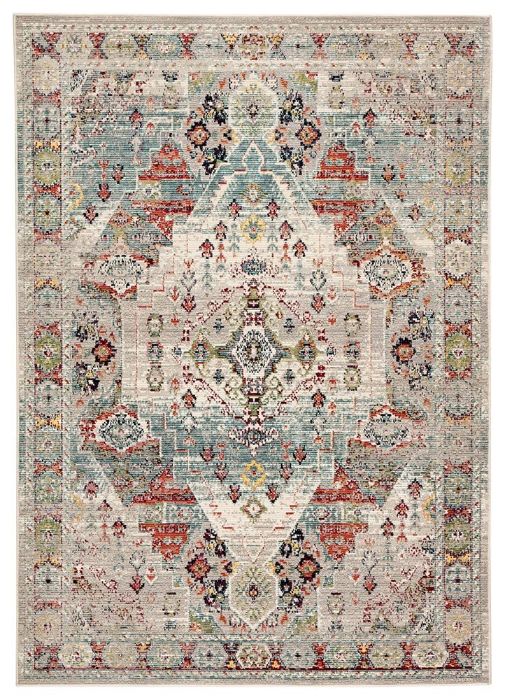 Showcasing an intricate medallion pattern in a vivid multicolor and gray palette. Crafted of weather-resistant polypropylene, this updated traditional rug boasts ribbed pile that emulates classic hand-knotted construction.