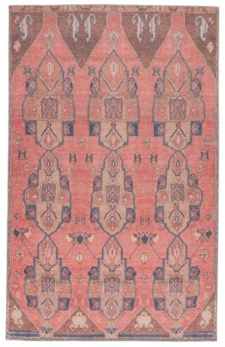 This vintage-inspired collection brings a playful and warm vibe to contemporary spaces. Featuring an ornate medallion design in saturated tones of pink, tan, and dark blue. This printed style offers the timelessness of a classic Turkish motif with the versatility and affordability of a power-loomed rug.