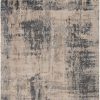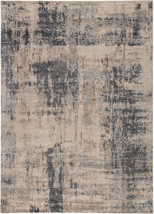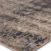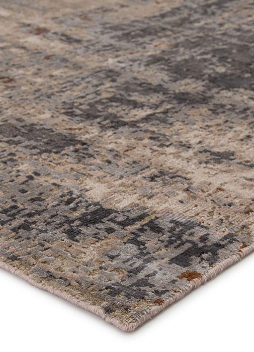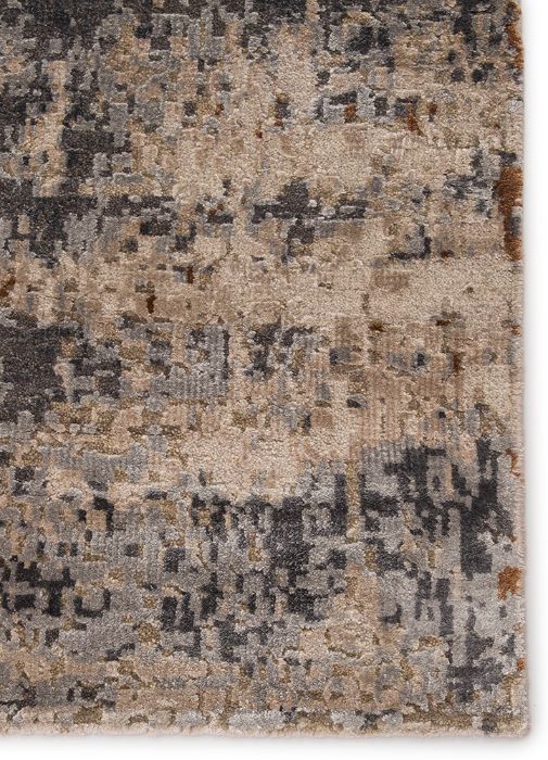 The rug boasts a mottled abstract pattern in deep gray, taupe, beige, and golden tan. Crafted of luxe viscose and natural wool, this elegantly abrashed rug boasts a lovely sheen along the carved, textural pile.