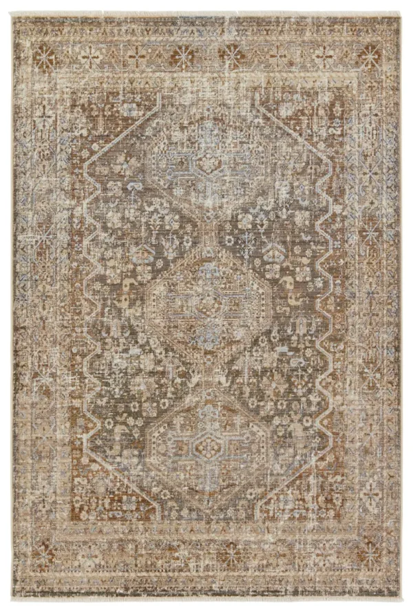 Inspired by the vintage perfection of sun-bathed Turkish designs, this collection showcases detailed traditional motifs that have been updated with on-trend, saturated colorways. Boasting a distressed traditional pattern in tones boasts a bold center medallion in moody tones of tan, taupe, caramel, blue, and green. This power-loomed rug features cotton fringe detailing, a natural result of weft yarns, that echoes hand-knotted construction and adds brilliant texture to the plush, durable polypropylene pile.