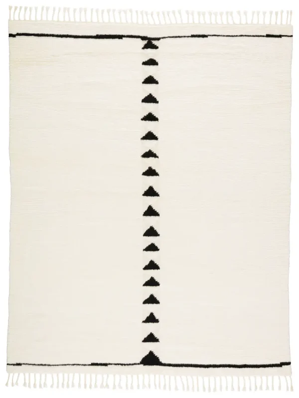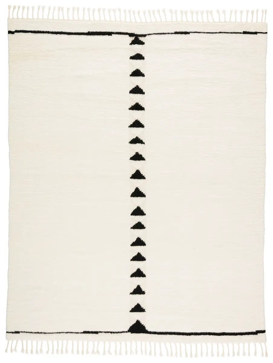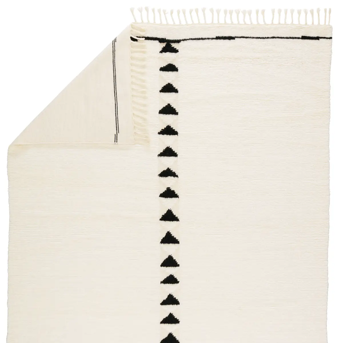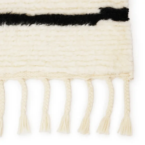 The DSKDIR collection melds modern allure with the global vibes of Morocco. The hand-knotted rug showcases a geometric linear pattern with contrasting black and cream tones. This handcrafted rug boasts plush, cut wool pile that pairs beautifully with braided tassel details. Perfect for adding warmth to cozy bedrooms and sitting areas, this inviting accent complements a range of decor and styles.