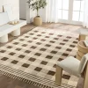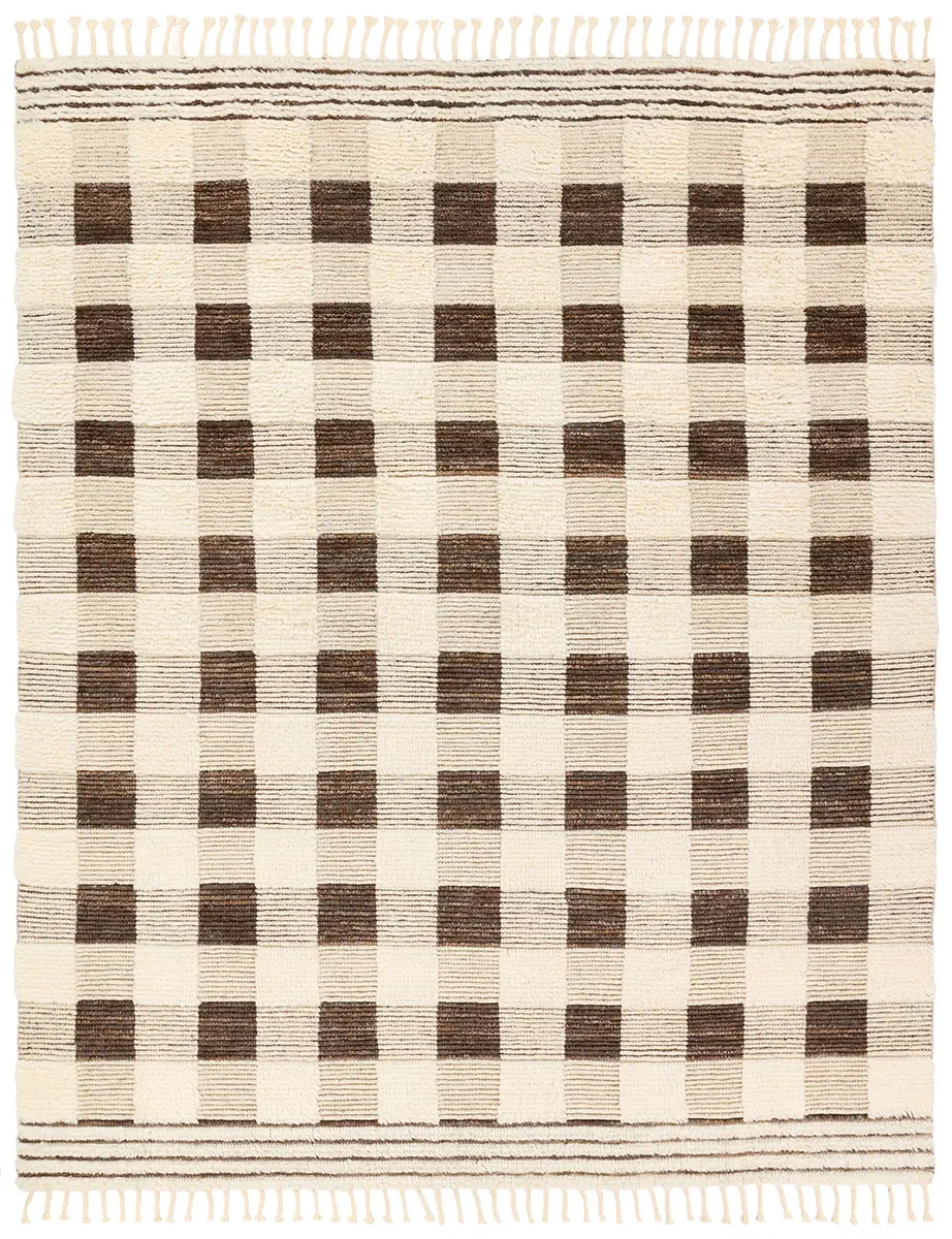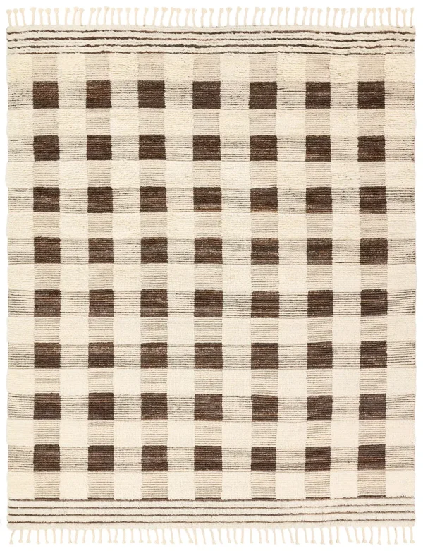 The DSKDIR collection melds modern allure with the global vibes of Morocco. The hand-knotted rug showcases a geometric grid pattern with contrasting brown, cream, and tan tones. This handcrafted rug boasts plush, cut wool pile that pairs beautifully with braided tassel details. Perfect for adding warmth to cozy bedrooms and sitting areas, this inviting accent complements a range of decor and styles.