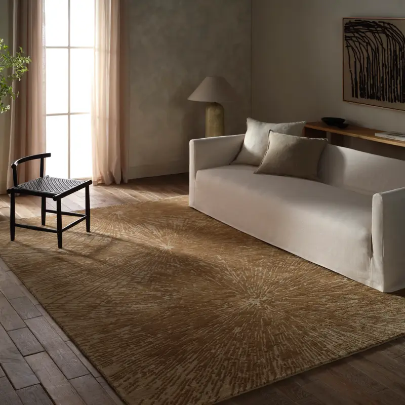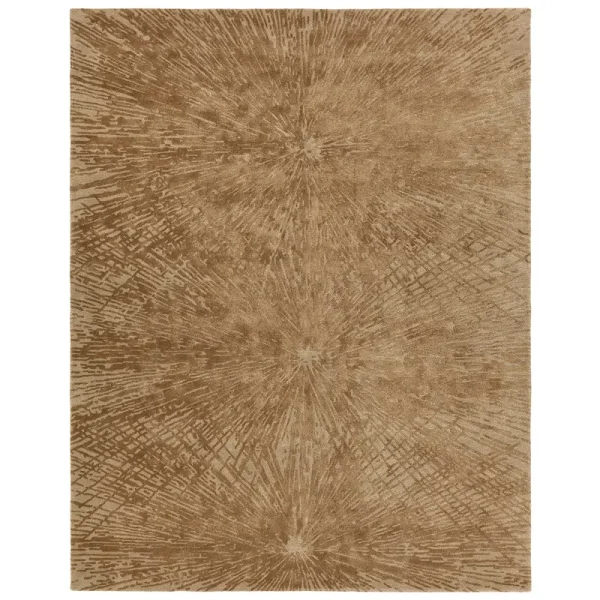 The hand-tufted FRGDIR collection features nature and mineral-inspired motifs that offer the perfect patterned intrigue to modern spaces. The design draws from the ethereal beauty of light, featuring a scattered, luminous effect in warm brown tones that transforms any room with a soft, radiant glow. A luxurious wool-viscose blend is cut, then hand-embossed to create a captivating interplay of texture, luster, and depth.