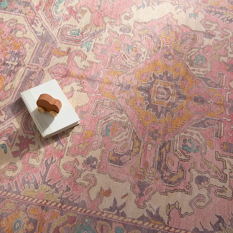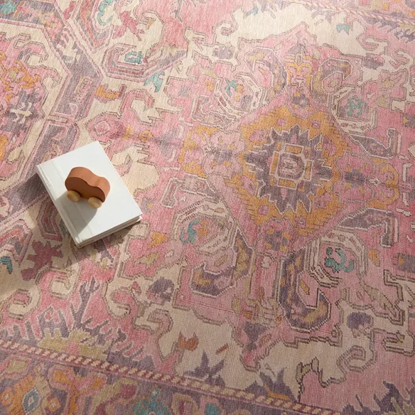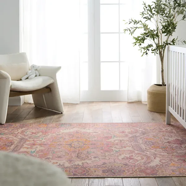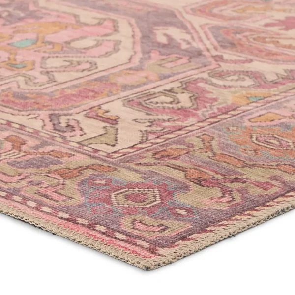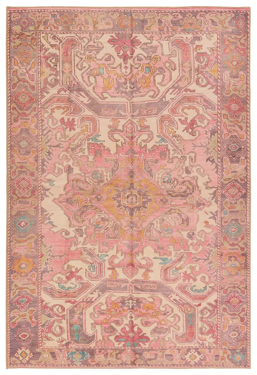 Inspired by coveted vintage finds, the GARDIR collection emulates the well-worn details and the beautiful abrash nature of antique textiles. The design showcases a center medallion and intricate border with tribal and floral details throughout. Pink and purple hues dominate this rug with gold, cream, light blue, and sage accent colors that create an intriguing and vivid addition to any home. Distressing adds dimension to the Turkish, traditional style. In Turkey, this digital design is printed onto the 1/5th inch thick, polyester base, cut, and embellished with edge stitching for a finished look. Up to four times machine washable, this printed accent piece provides a durable quality that cleans up effortlessly while withstanding heavy traffic, children, and pets.
