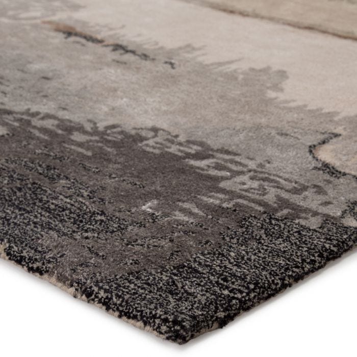An abstract design in contrasting, neutral tones of black, gray, taupe, and a hint of gold recall a moody landscape motif, highlighted in lustrous viscose and plush wool.