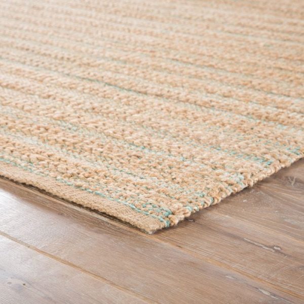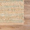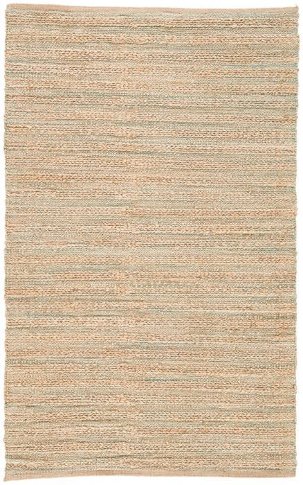 A natural area rug with a contemporary touch, this cotton-backed layer’s golden beige tone and hints of green and pale blue striated accents make a cool, casual statement. The organic texture of the hand-woven rayon and jute fibers offers an intriguing feel and bohemian-inspired style.
