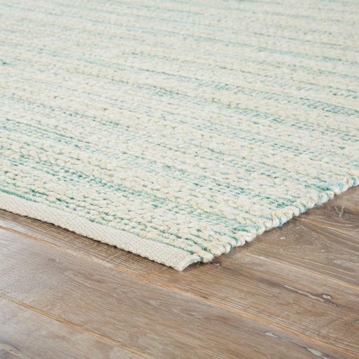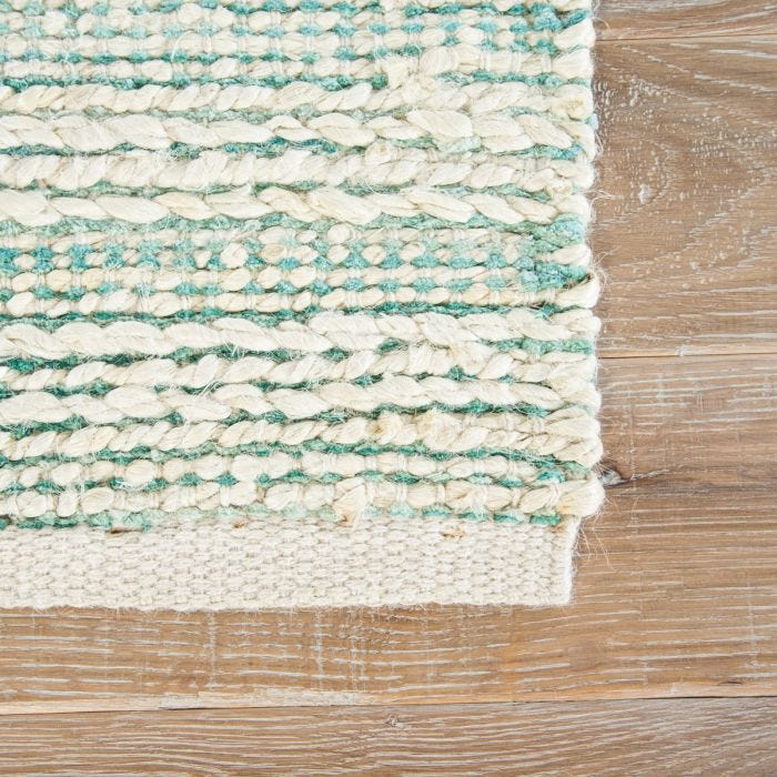 A natural area rug with a contemporary touch, this cotton-backed layer pops with a bleached white tone and hints of turquoise striated accents. The organic texture of the hand-woven rayon and jute fibers offers an intriguing feel and bohemian-inspired style.