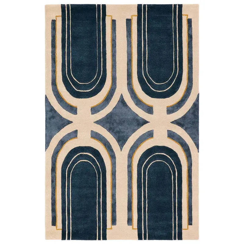 The sleek and angular Iconic collection infuses interiors with bold colorways and modern style. A playful geometric motif and on-trend navy, cream, and yellow colorway come together to form the mid-century modern rug. Hand tufted of viscose and New Zealand wool, this fresh accent boasts cut pile for added texture and dimension. Due to the soft fibers, this rug best suits low traffic areas of the home like formal living rooms, dining areas, bedrooms, and sitting rooms. The RugMark certification proves this accent piece is ethically crafted.