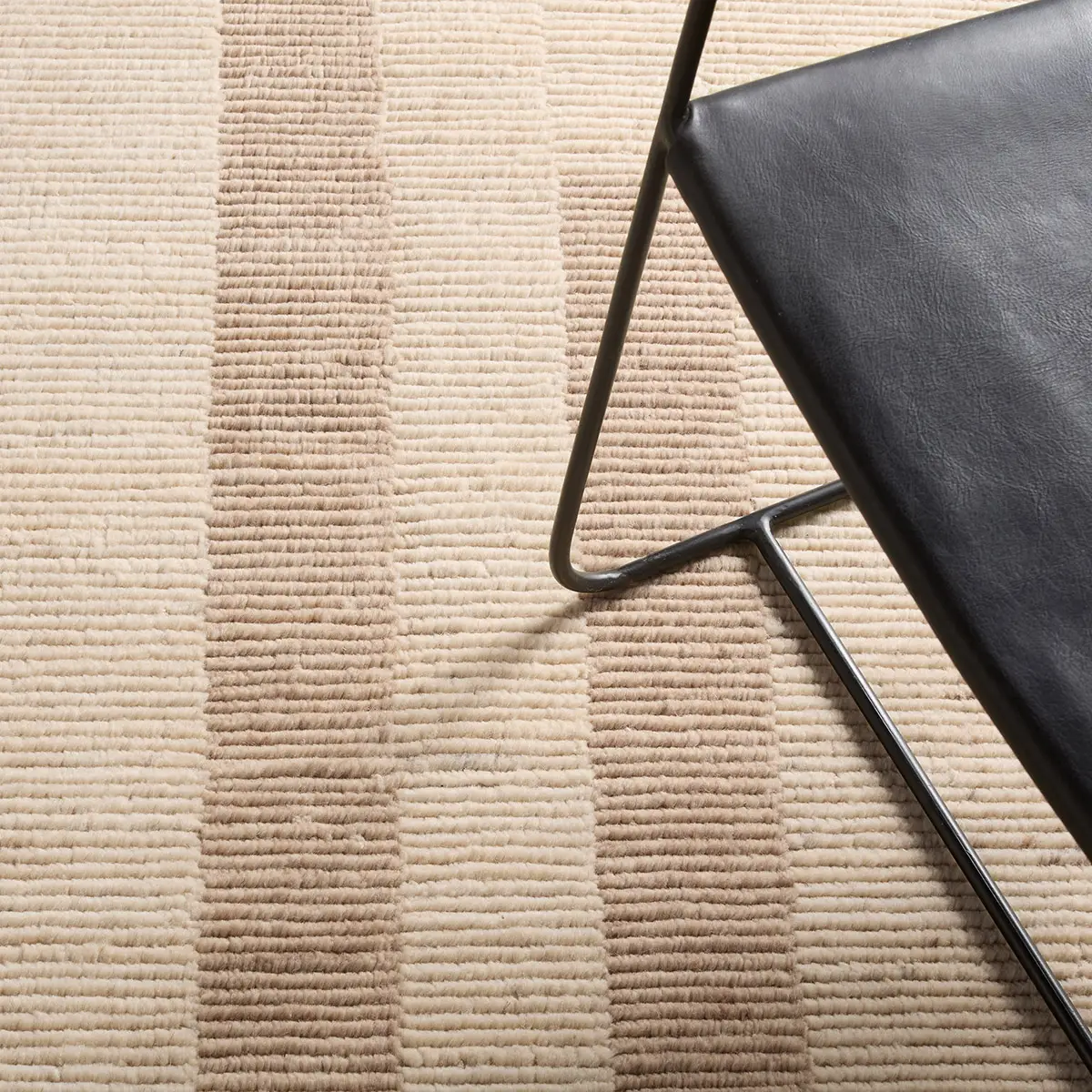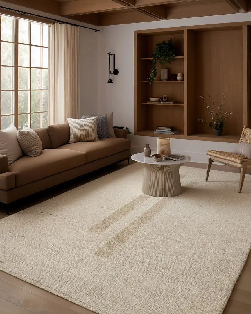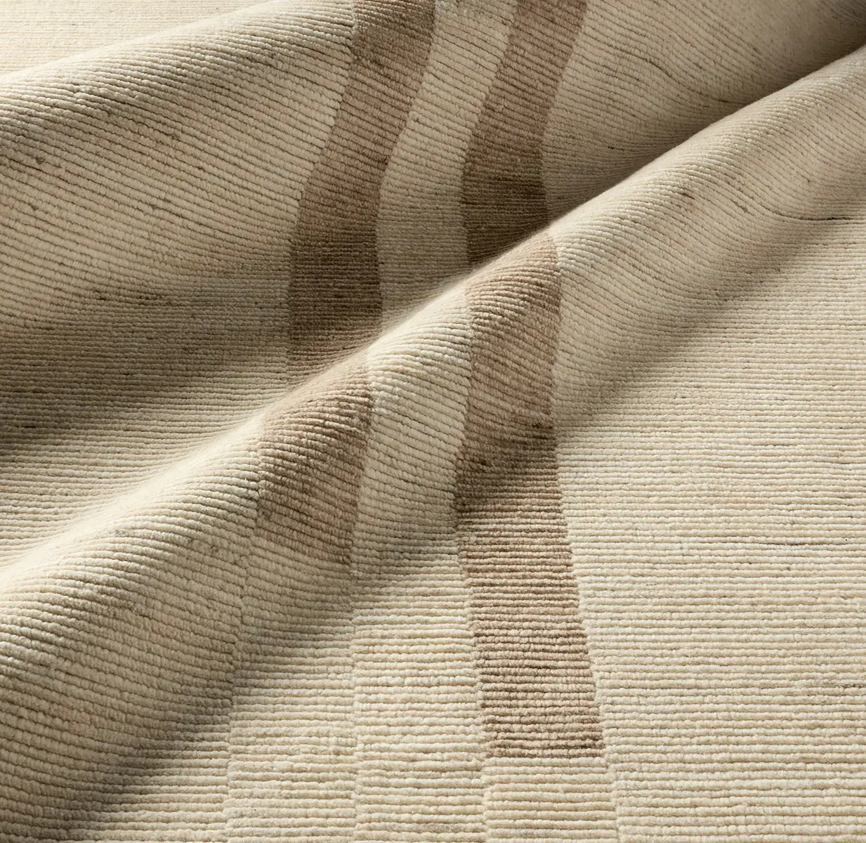 The design masterfully blends Scandinavian warmth with Japanese minimalism through its thoughtfully designed, neutral palette. Handcrafted from Afgan Wool, its ivory and tan beige tones feature subtle abrash dyeing, creating a serene, low pile with a distinct ribbed texture and elevated geometric stripes.