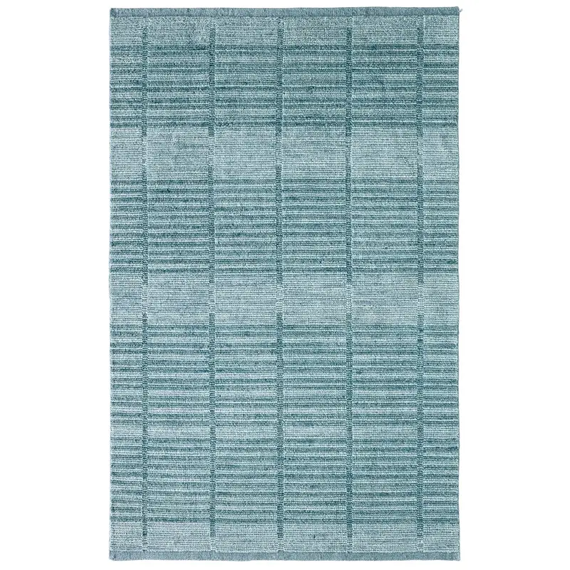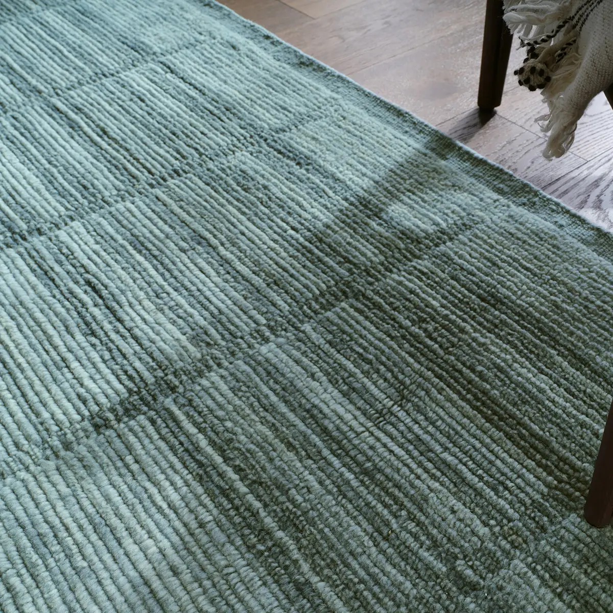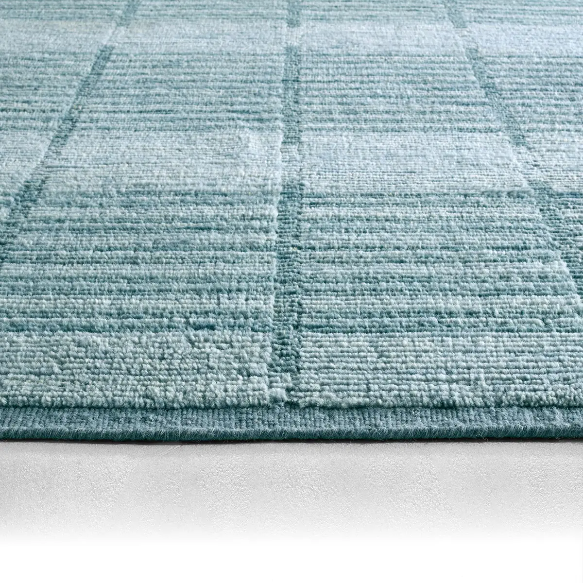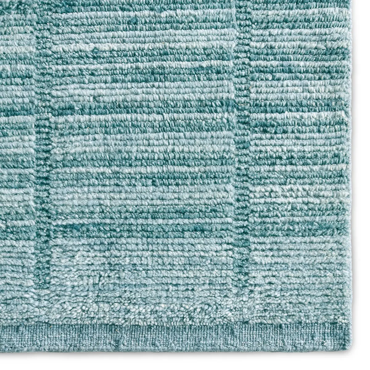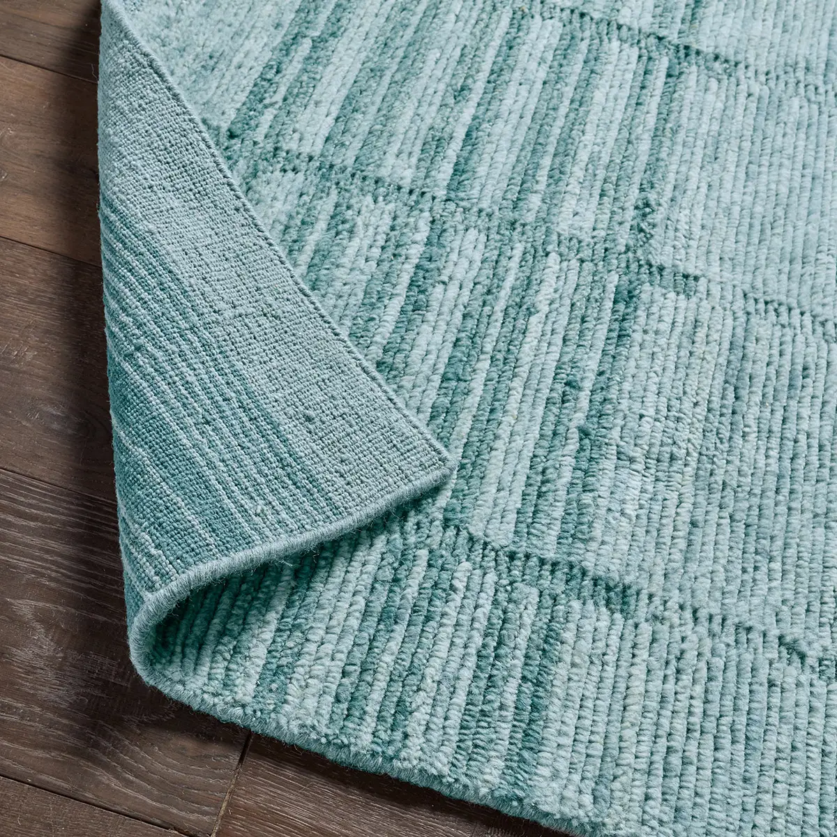 Reflecting tranquil vistas, the design offers a serene and contemporary spirit. This artisan quality rug showcases a sophisticated grid pattern in a refreshing palette of teal and aqua blue, presenting an inviting softness with a high low pile and a lustrous sheen.