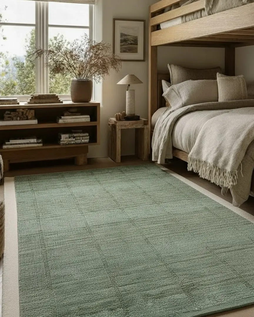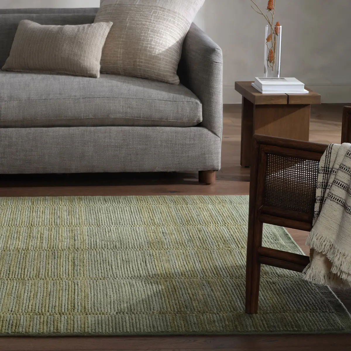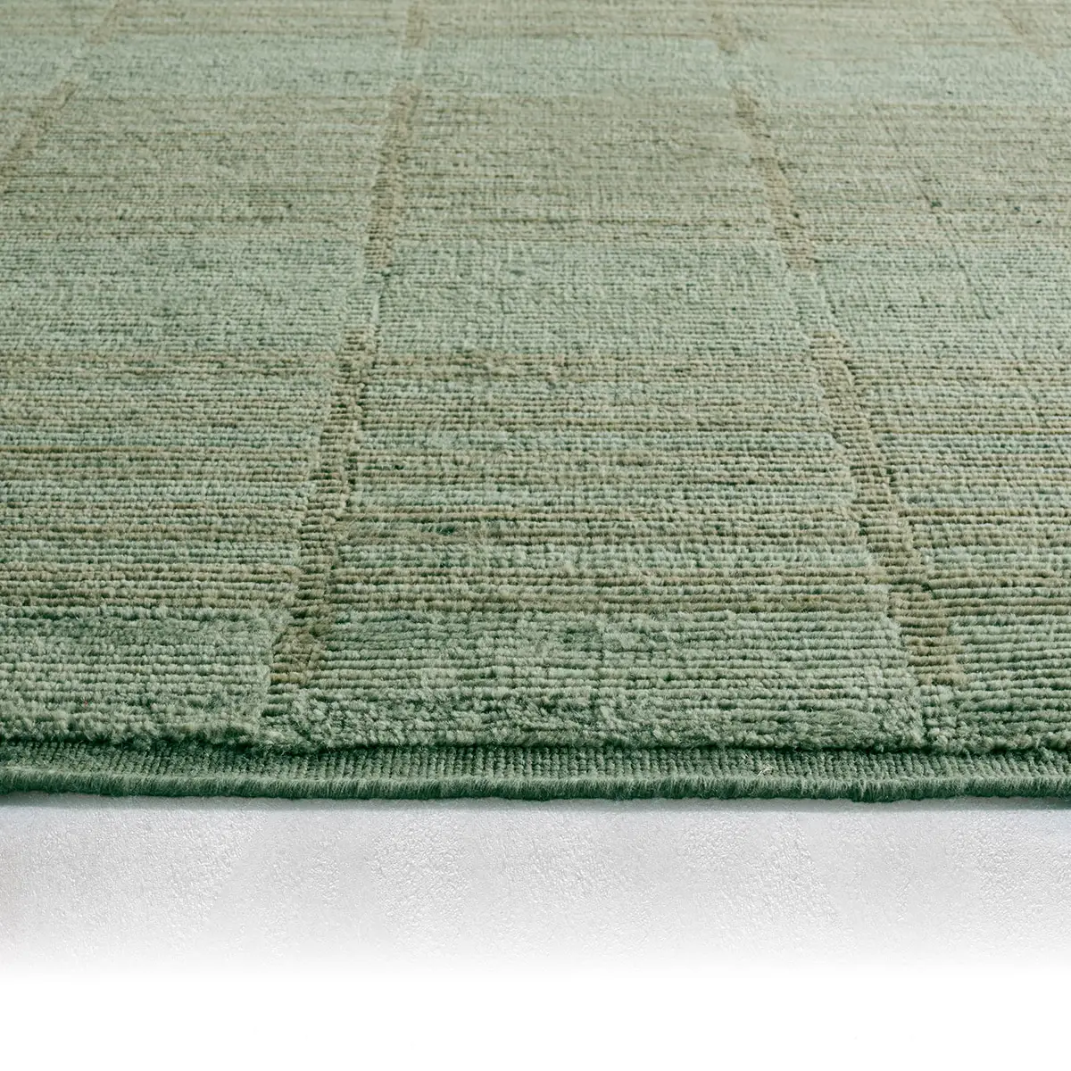 The design evokes serene green vistas, blending Scandinavian warmth and Japanese minimalism. Crafted from Afgan wool, its artisan hand loomed pile offers inviting softness and a lustrous texture, showcasing a sophisticated high low grid and ribbed pattern in nuanced sage and olive.