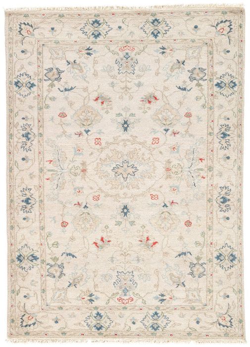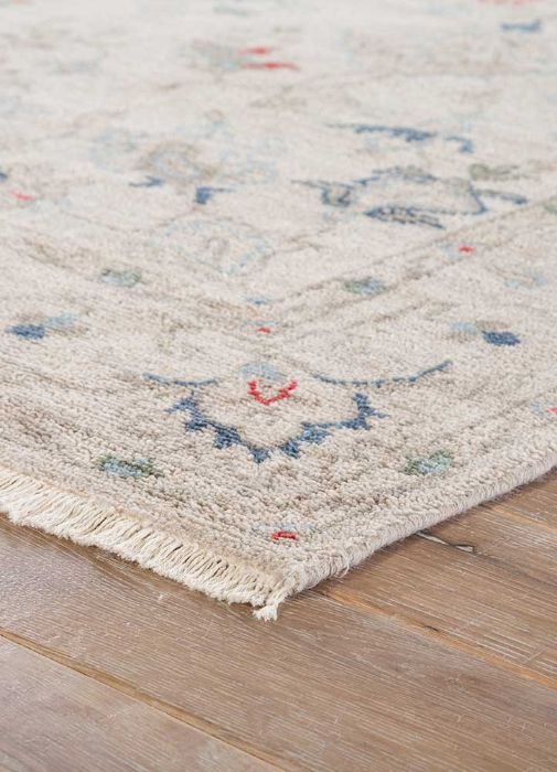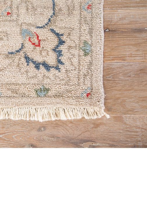This luxurious hand-knotted wool rug combines a whimsical colorway with a stunning traditional floral pattern for a fresh, updated look in living rooms and dining spaces. Brilliant blue and orange details decorate the scrolling vines and blooms of this ivory accent.