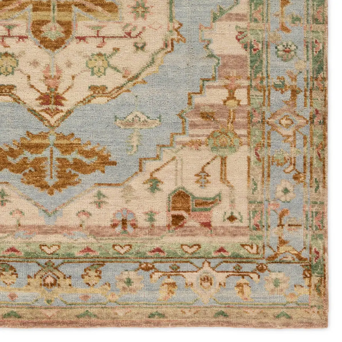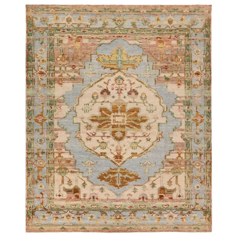 The hand-knotted JINDIR collection features a fresh incarnation of the vintage Turkish textile look. Classic in pattern and modern in color, the Jude rug boasts a blue, rust, green, and cream hues with distinct dye-lot details. This artisan-crafted, medallion rug is made of hand-carded wool and has a low, durable pile for the perfect grounding accent in any room.