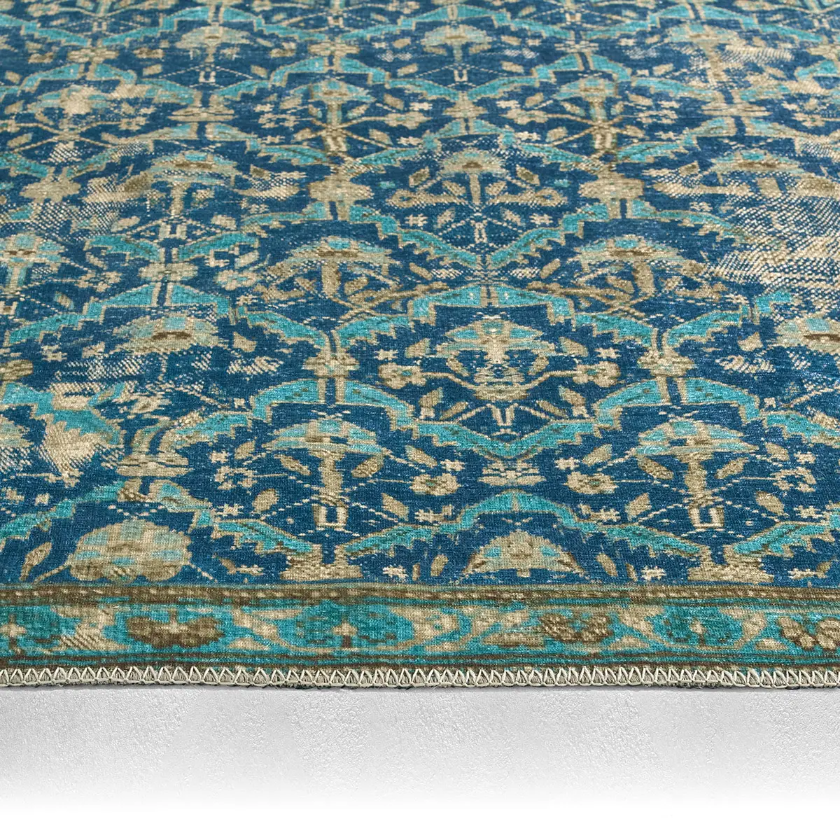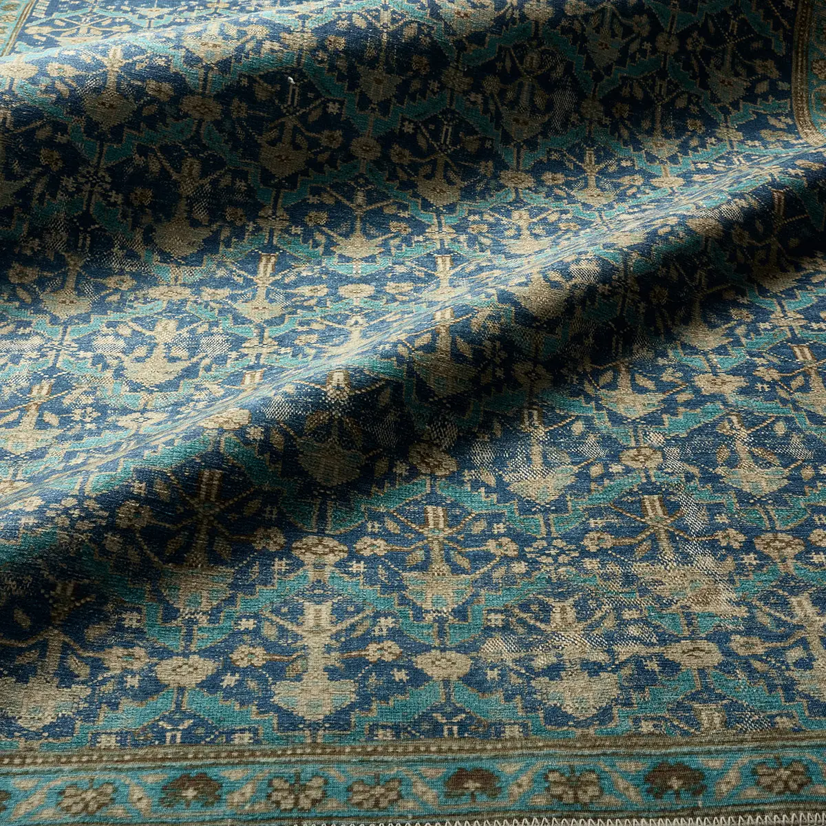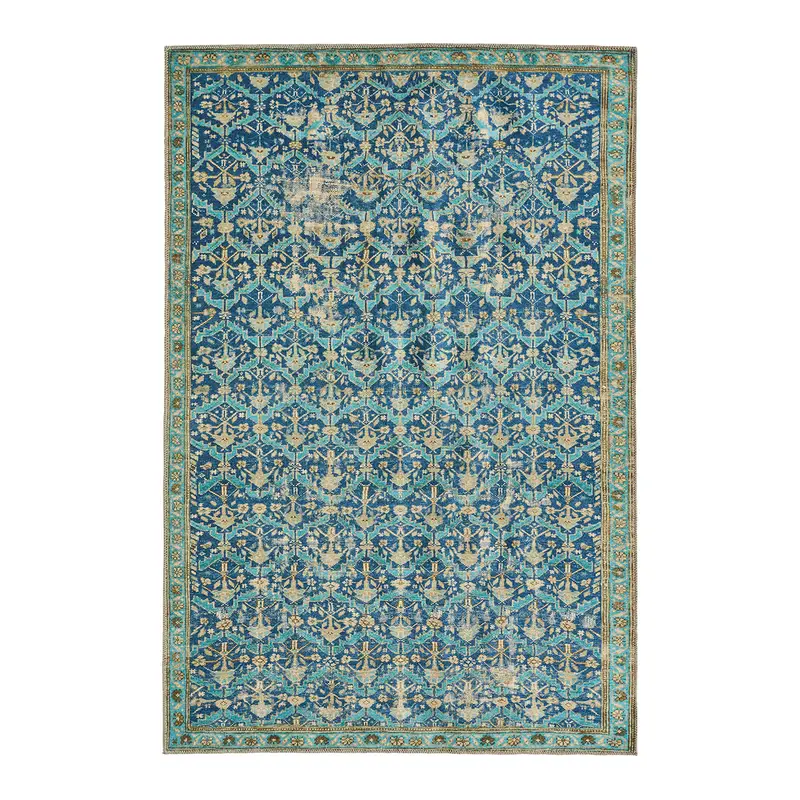 The design from the KNDDIR collection brings a sense of rhythm and movement to the room, with a repeating geometric pattern that unfolds in layered blues, vibrant turquoise, and warm tan. Softened by a gently distressed finish that adds a lived-in, timeless feel. The printed powerloom base provides effortless living, offering durability, fade resistance, and easy care, while its low pile remains versatile for high-traffic spaces.