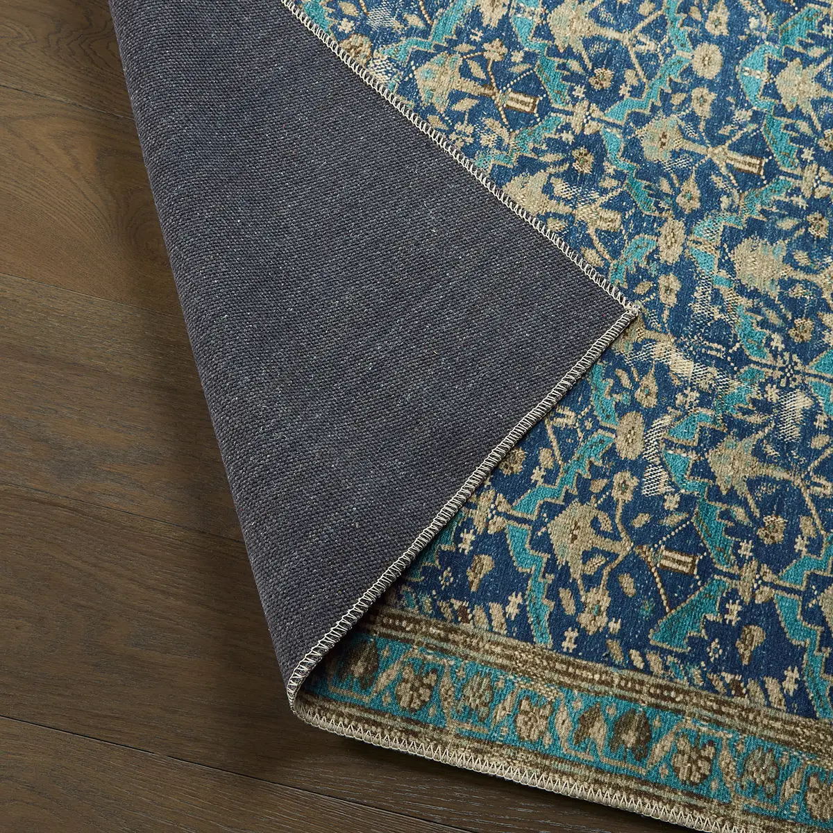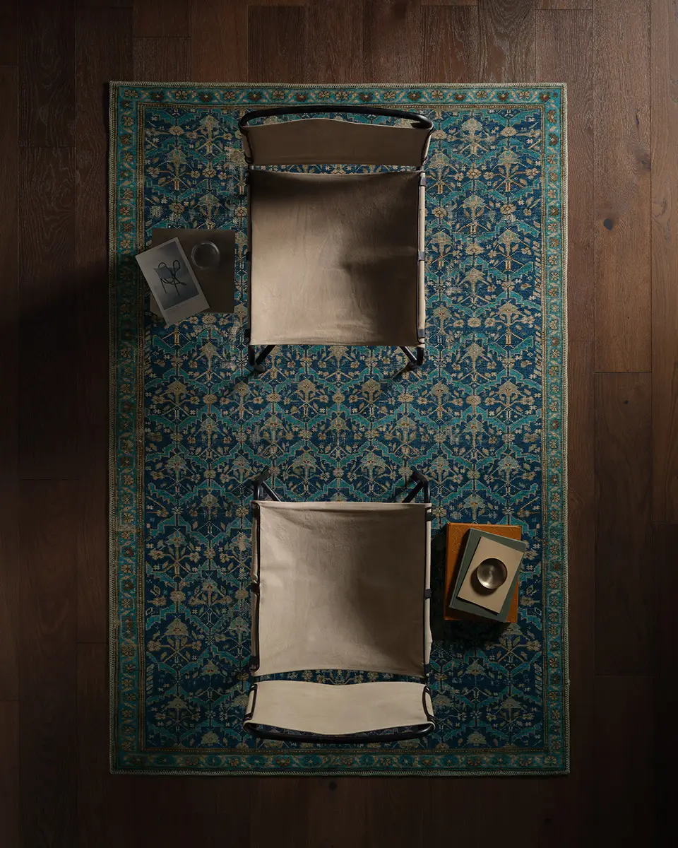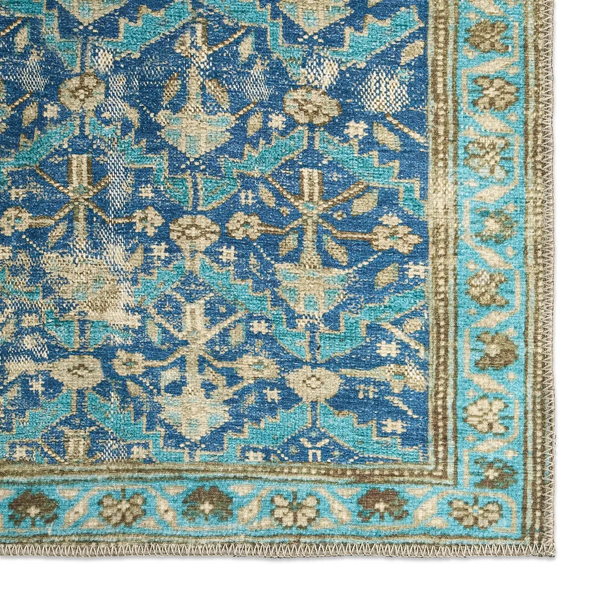 The design from the KNDDIR collection brings a sense of rhythm and movement to the room, with a repeating geometric pattern that unfolds in layered blues, vibrant turquoise, and warm tan. Softened by a gently distressed finish that adds a lived-in, timeless feel. The printed powerloom base provides effortless living, offering durability, fade resistance, and easy care, while its low pile remains versatile for high-traffic spaces.