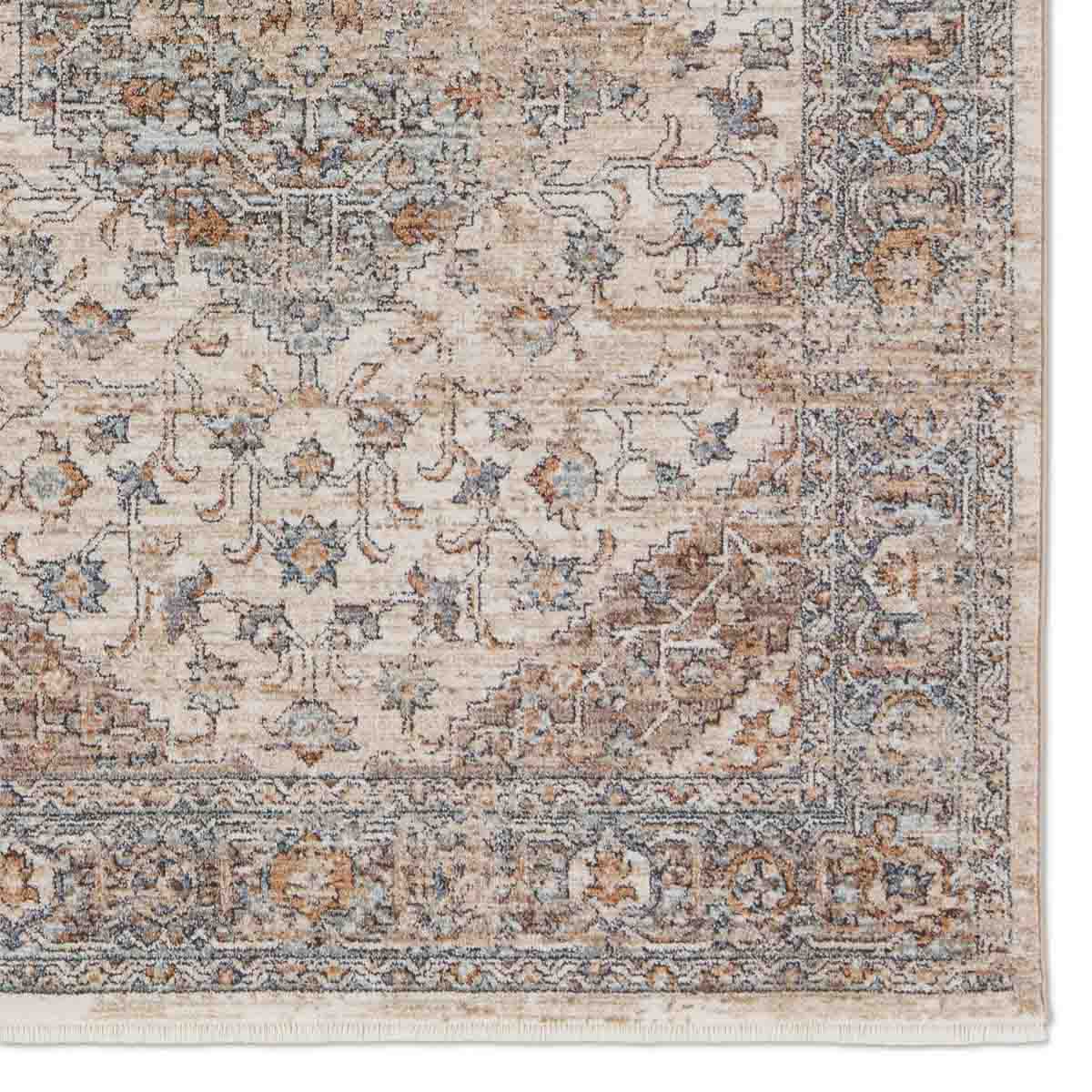 Inspired by the distressed perfection of antique textiles, the LARDIR collection is warm and inviting with rich, updated hues. The updated traditional Heir area rug showcases an intricate medallion and border design paired with short, cream fringe. The floral details spring to life in hues of beige, blue, cream, orange, light brown, and hints of gray. This indoor rug thrives in high and low trafficked areas of the home such as living rooms, halls, entryways, bedrooms, and dining areas.
