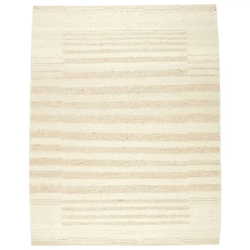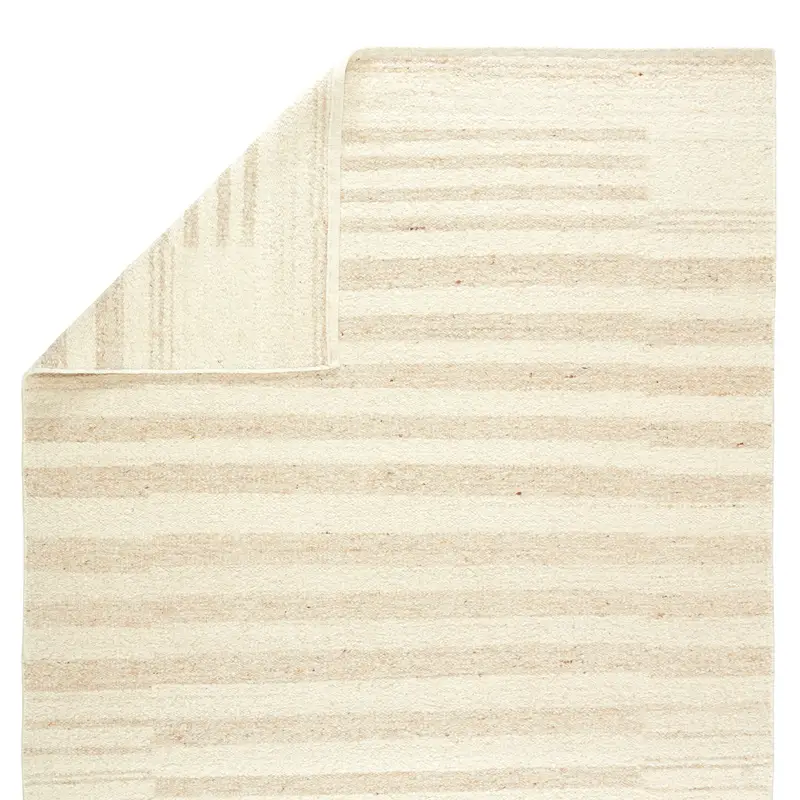 The texture-rich LEODIR collection offers an assortment of updated kilim looks, re-invented with the on-trend shearling style and neutral, modern palettes. The handwoven rug features a globally inspired, light tan, stripe pattern on a neutral cream base. This 100% wool accent piece delights in high and low traffic spaces such as bedrooms, living areas, dining rooms, halls, sitting rooms, and entryways.