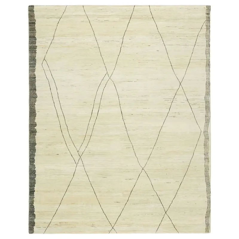 The MNIDIR collection features designs inspired by North African motifs and an exceptional hand-knotted quality. Neutral and easy-to-decorate, the rug boasts a broken lattice pattern, grounding global spaces with tones of cream, black, and dark brown.
