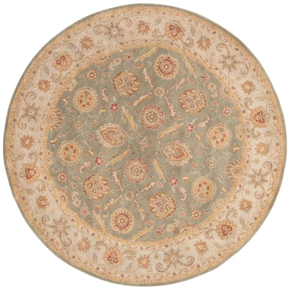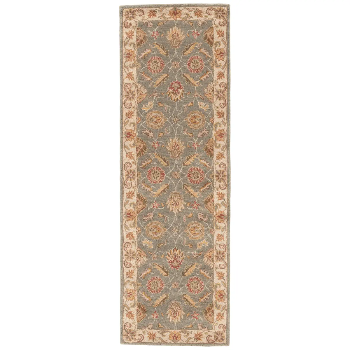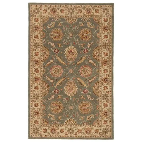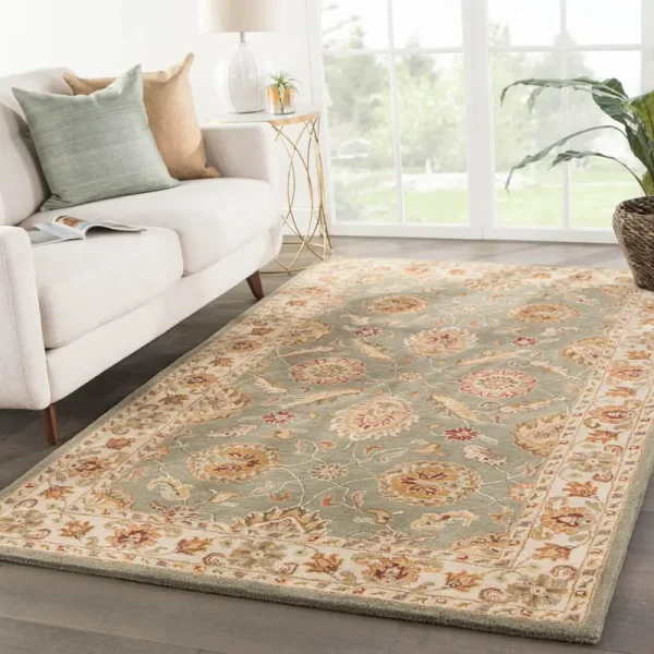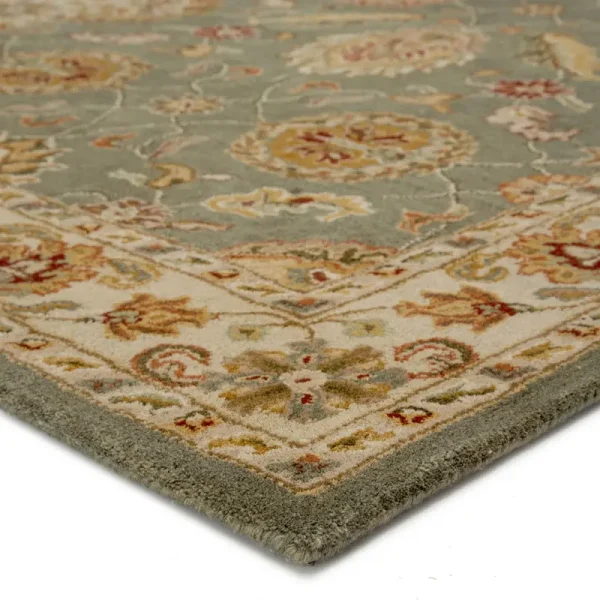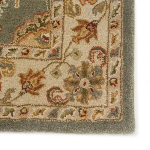 . This hand-tufted area rug offers vintage elegance to traditional homes. Scrolling vines and floral medallions gracefully cover this classic wool layer in sage green, warm beige, and rusted red-brown.