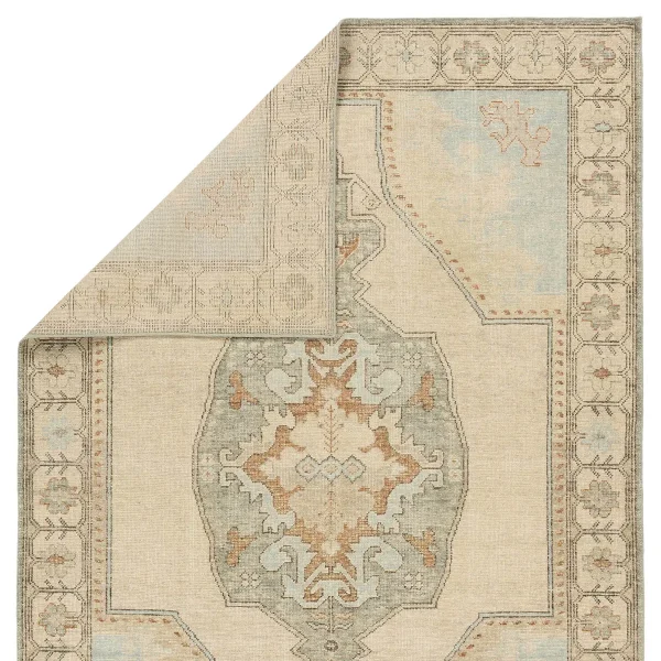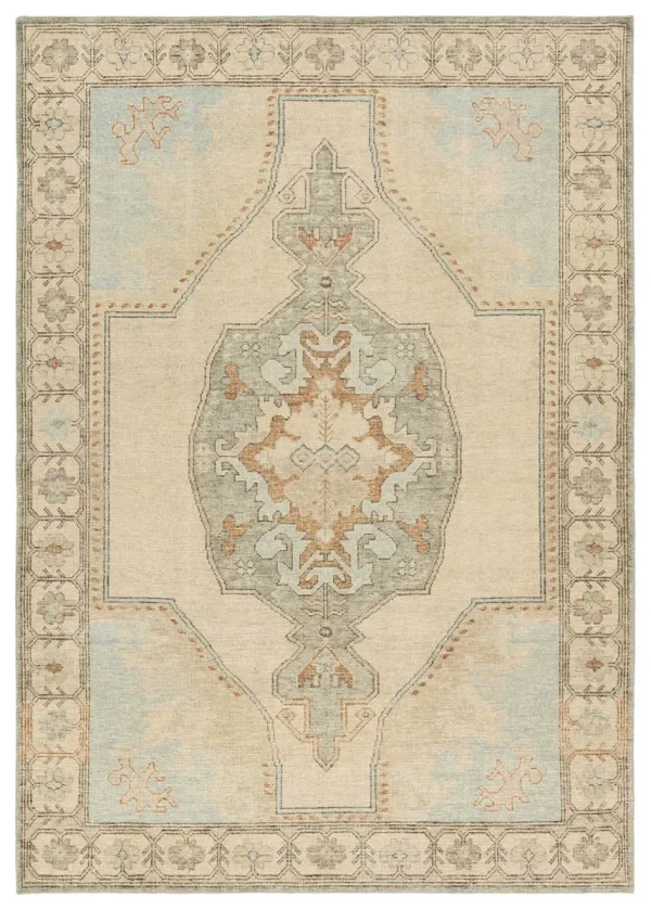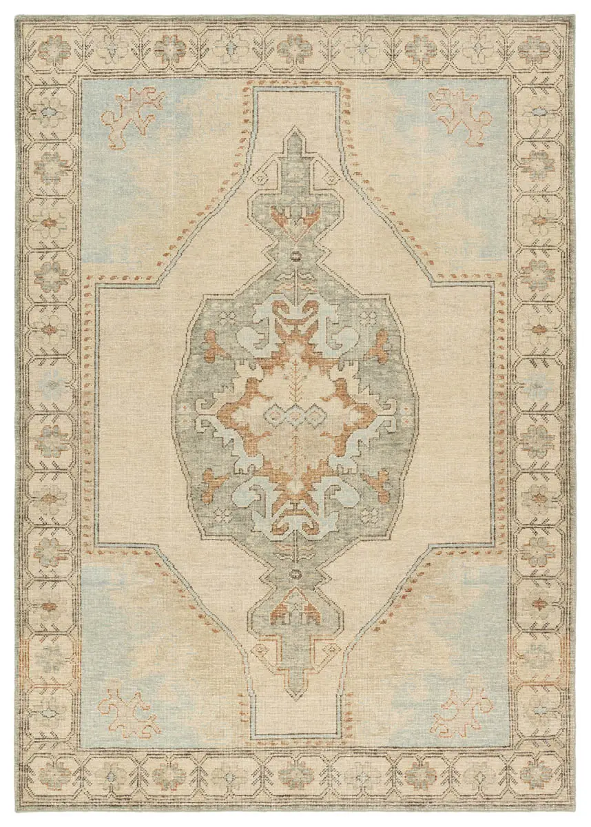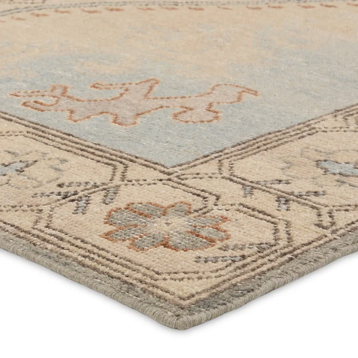 The ONEDIR collection marries traditional motifs with soft, subdued colorways for the perfect blend of fresh and time-honored style. These hand-knotted wool rugs feature a hand-sheared quality that lends the design a coveted vintage impression. The rug features an updated traditional medallion motif in beige and grey with accents of rust and light blue. The low, wool pile proves easy-to-clean, perfect for any room of the home.