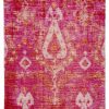 The area rug makes a bold global statement in fun, contemporary hues. The vibrant red and pink palette highlights the resist dye-inspired design for a playful and worldly look in kitchens, living rooms, or on patios.