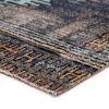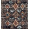 The area rug boasts whimsical diamond tribal design, bringing a Southwest vibe to contemporary spaces. Accents of blue, orange, and yellow pop on the dark ground color for a fun, updated look in kitchens, living rooms, or on patios.