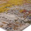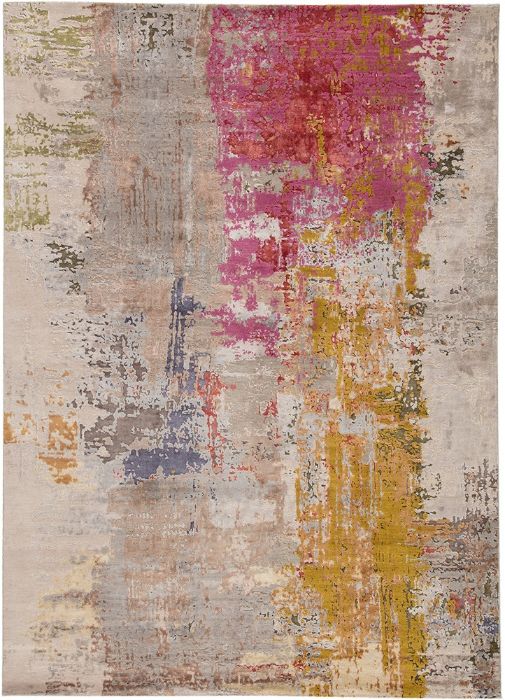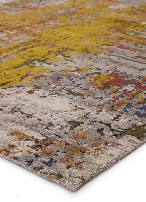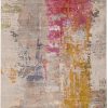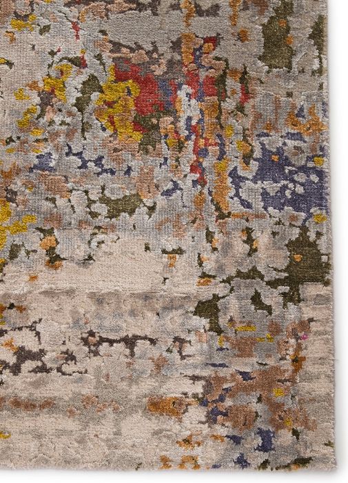Made of hand-carded wool and lustrous rayon made from bamboo, each tightly knotted piece employs 180 artisans in rural India. The hand-knotted rug showcases a modern abstract design in bold multicolor hues on a tonal gray backdrop.