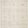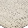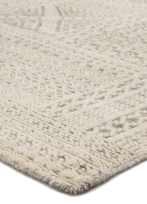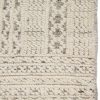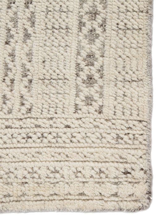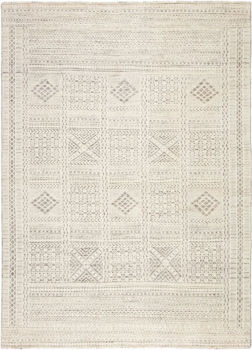 The hand-knotted rug boasts an intricate geometric design in a neutral ivory and light gray colorway. This wool rug’s textured pattern grounds spaces with striking depth and dimension.