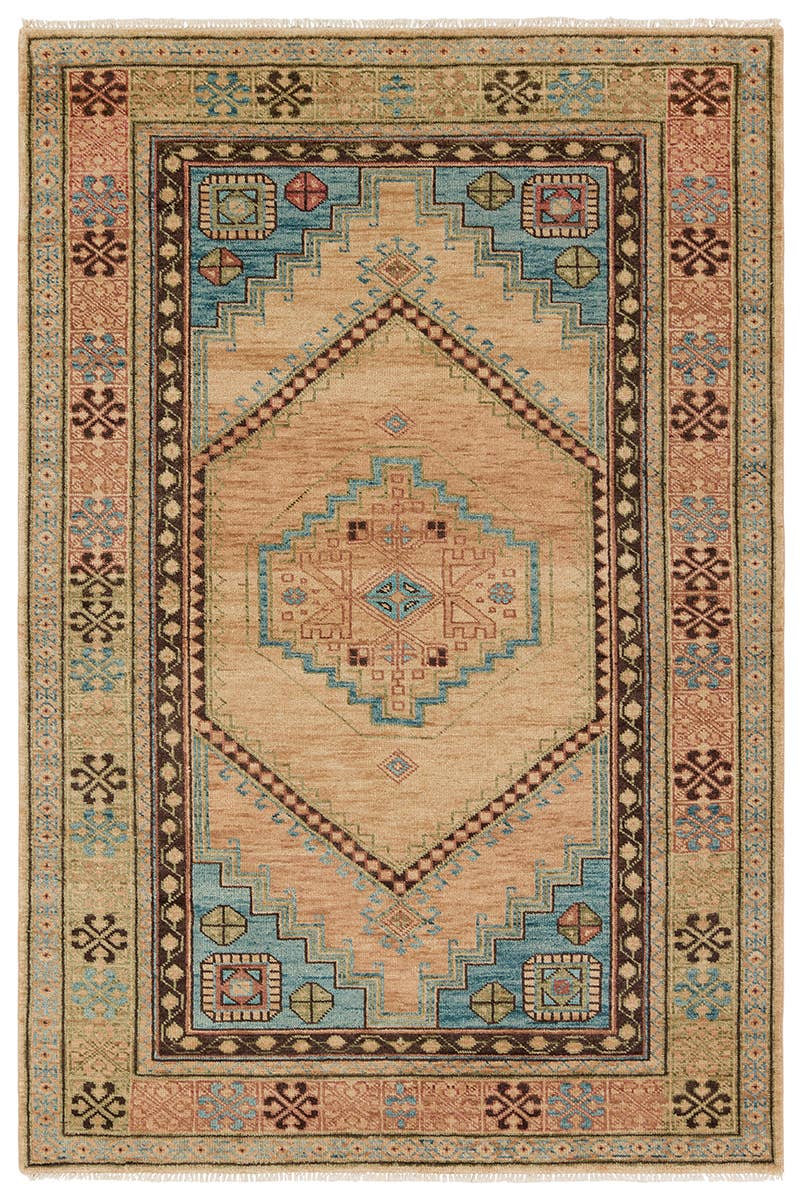 The eye-catching and boldly colored REZDIR collection features an assortment of Turkish-inspired designs that emulate the unique bazaar finds overseas. These handknotted designs boast a 100% wool construction for heirloom-quality durability. The rug features a medallion and intricate border in hues of vivid blue, tan, red, sage, beige, and brown. The low pile creates an easy-to-clean accent piece that thrives in both high and low traffic areas of the home.
