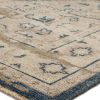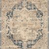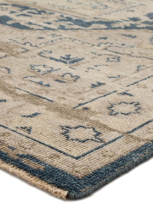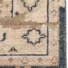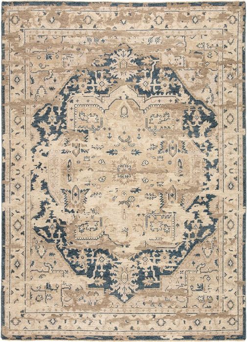 Featuring heirloom-quality designs of stunningly abrashed Old World patterns. The area rug showcases a distressed center medallion in natural taupe and deep blue hues. This durable wool handknot anchors living spaces with traditional style.