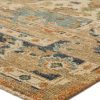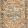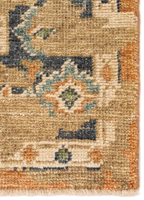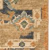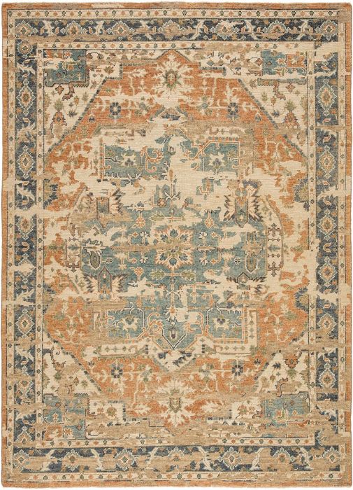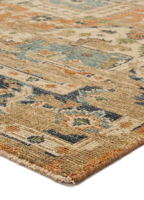 Featuring heirloom-quality designs of stunningly abrashed Old World patterns. The area rug showcases a distressed center medallion in orange, blue, and light green on a neutral beige ground. This durable wool handknot anchors living spaces with traditional style.