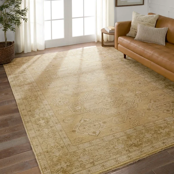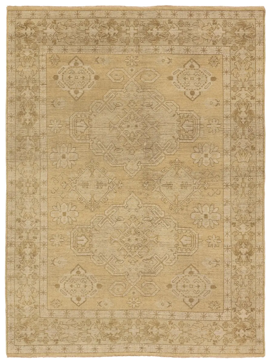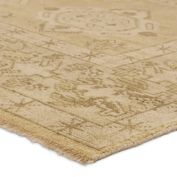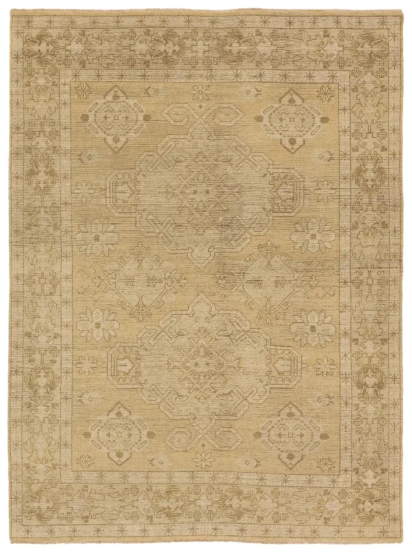 The RHADIR collection features heirloom-quality designs of stunningly abrashed Old World patterns. The area rug boastsĀ a beautifully washed medallion motif with a decorative border. The khaki tones are accented with cream and taupe hues for added depth and intrigue. This durable wool handknot anchors living spaces with a fresh take on vintage style.