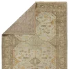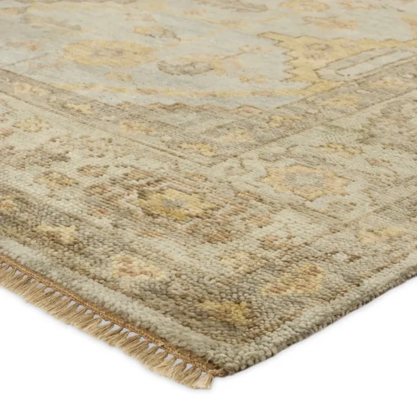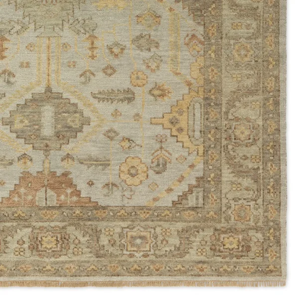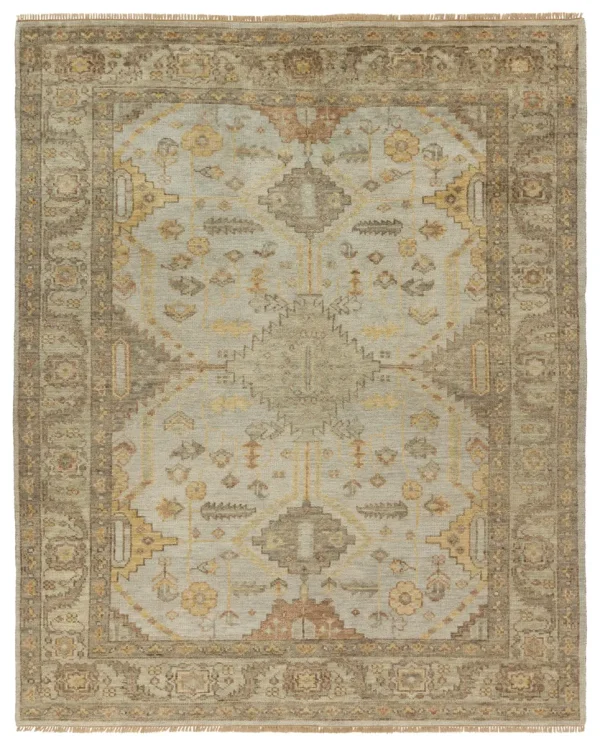 The RHADIR collection features heirloom-quality designs of stunningly abrashed Old World patterns. The area rug boasts a beautifully washed medallion motif with a decorative border.  The gray and brown tones are accented with light blue, sage, beige, and yellow hues for added depth and intrigue. This durable wool handknot anchors living spaces with a fresh take on vintage style.