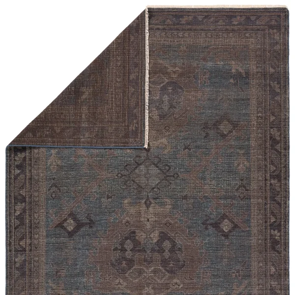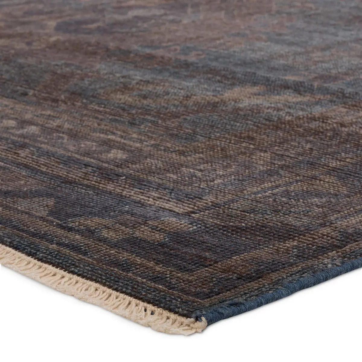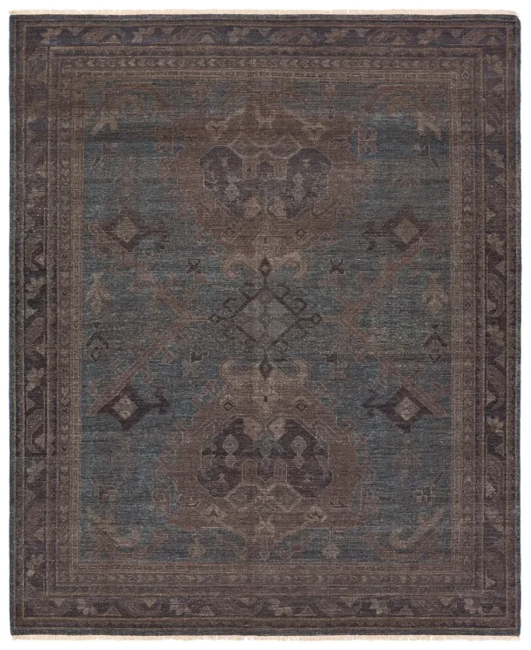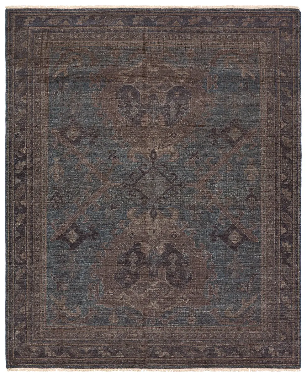 The RHADIR collection features heirloom-quality designs of stunningly abrashed Old World patterns. The area rug boasts a beautifully distressed dual-medallion motif with a decorative, multi-layered border and geometric detailing. The blue, brown, and gray hues add depth and intrigue. This durable wool handknot anchors living spaces with a fresh take on vintage style.