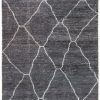 This modern hand-loomed rug enriches spaces with bold Geometric patterning and a temptingly soft feel. Texture-rich and captivating in sleek spaces, this accent showcases an asymmetrical Moroccan lattice design in a deep blue and white colorway.