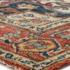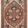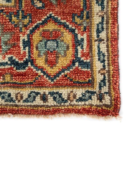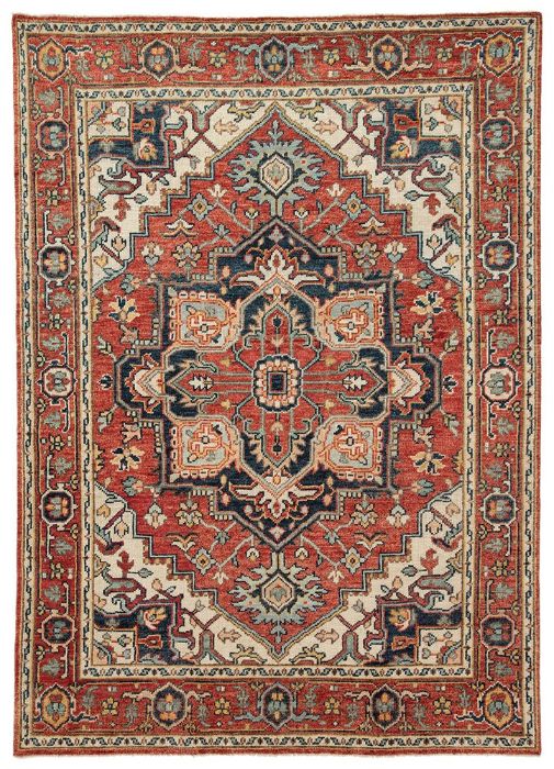 Punctuated by vibrant hues and intricate details, bringing a bold, transitional look to any home. The hand-knotted rug expresses classic, Serapi style with an intricate center medallion and surrounding border. Rich tones of blue and red ensure a timeless look, while the durable wool construction provide an heirloom-quality accent.blue color scheme.