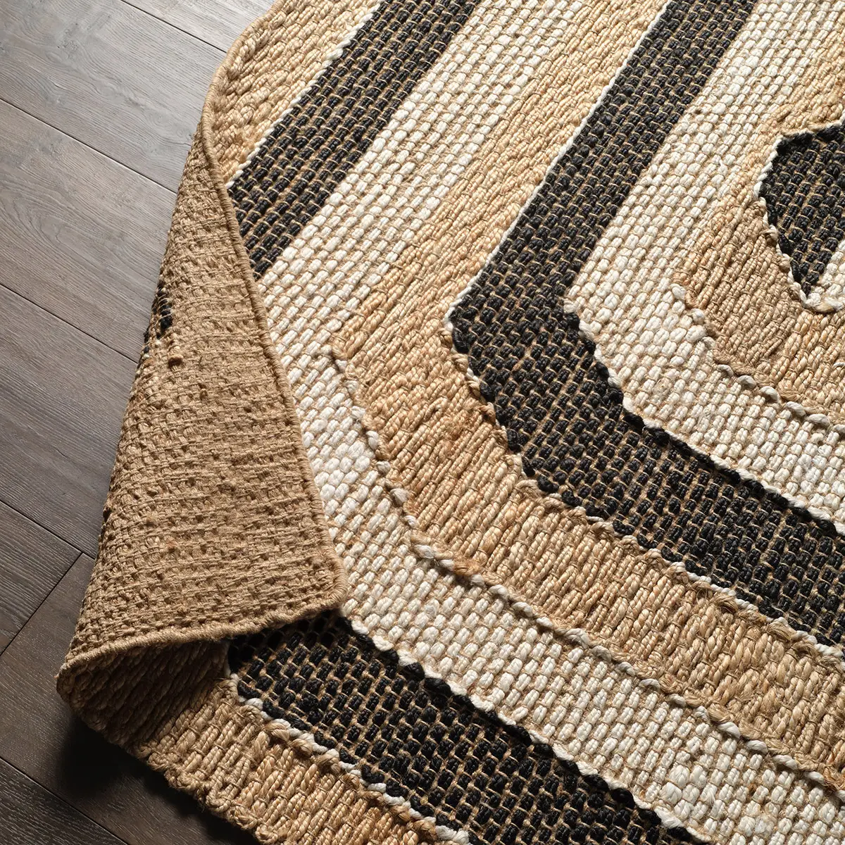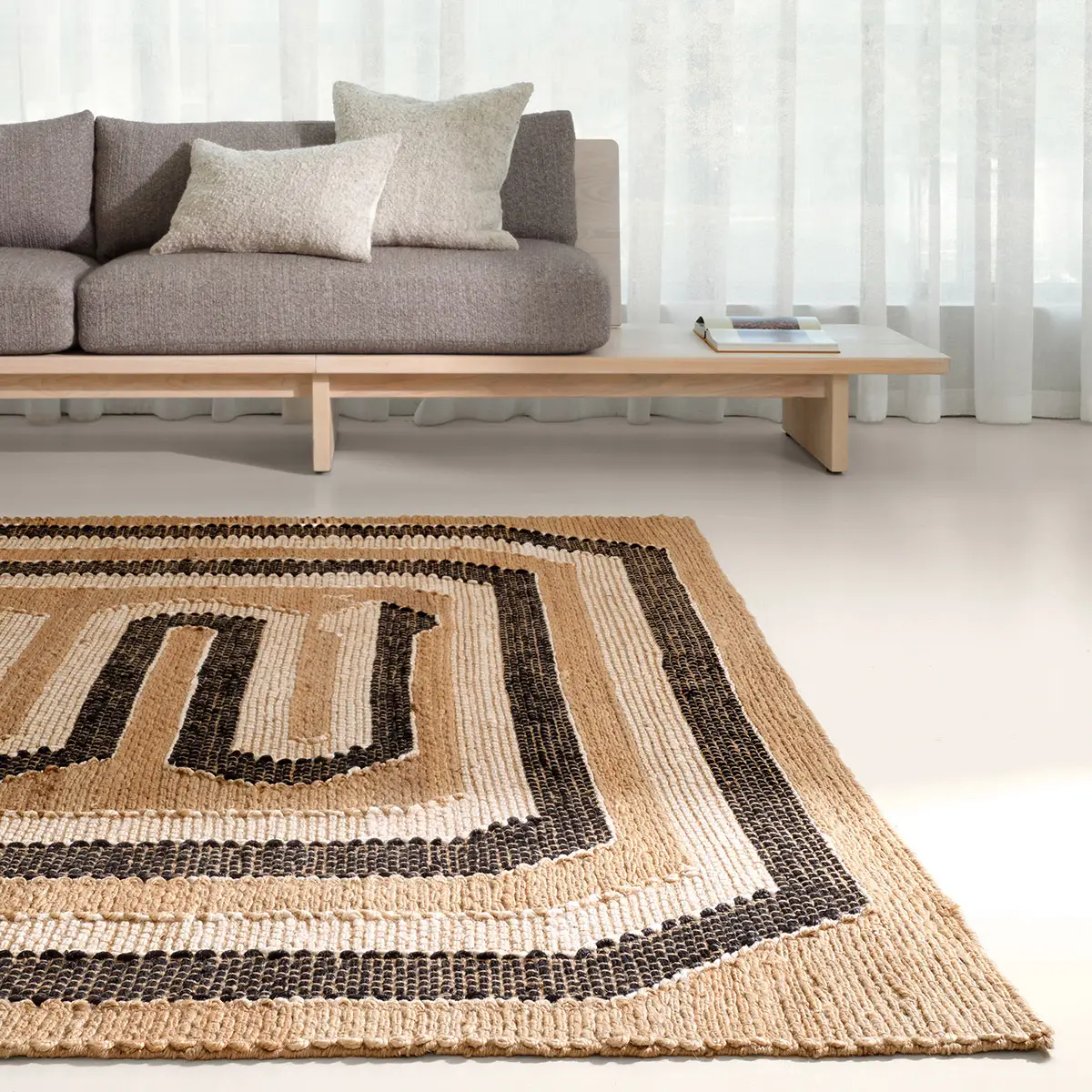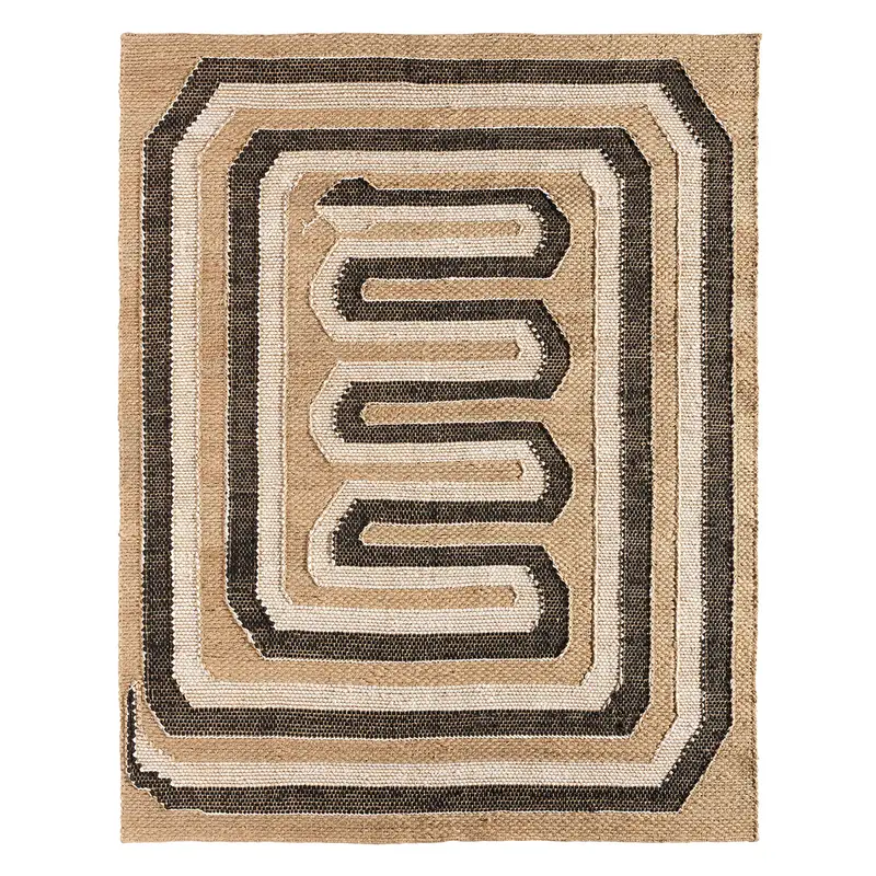 A serpent labyrinth is what jute dreams are made of. The design masterfully blends minimalism with primitivism, handwoven by artisans with sustainable jute. Its inviting textural pile features a captivating geometric snake motif in rich Tan-Beige and Black tones, creating a compelling statement for any home.