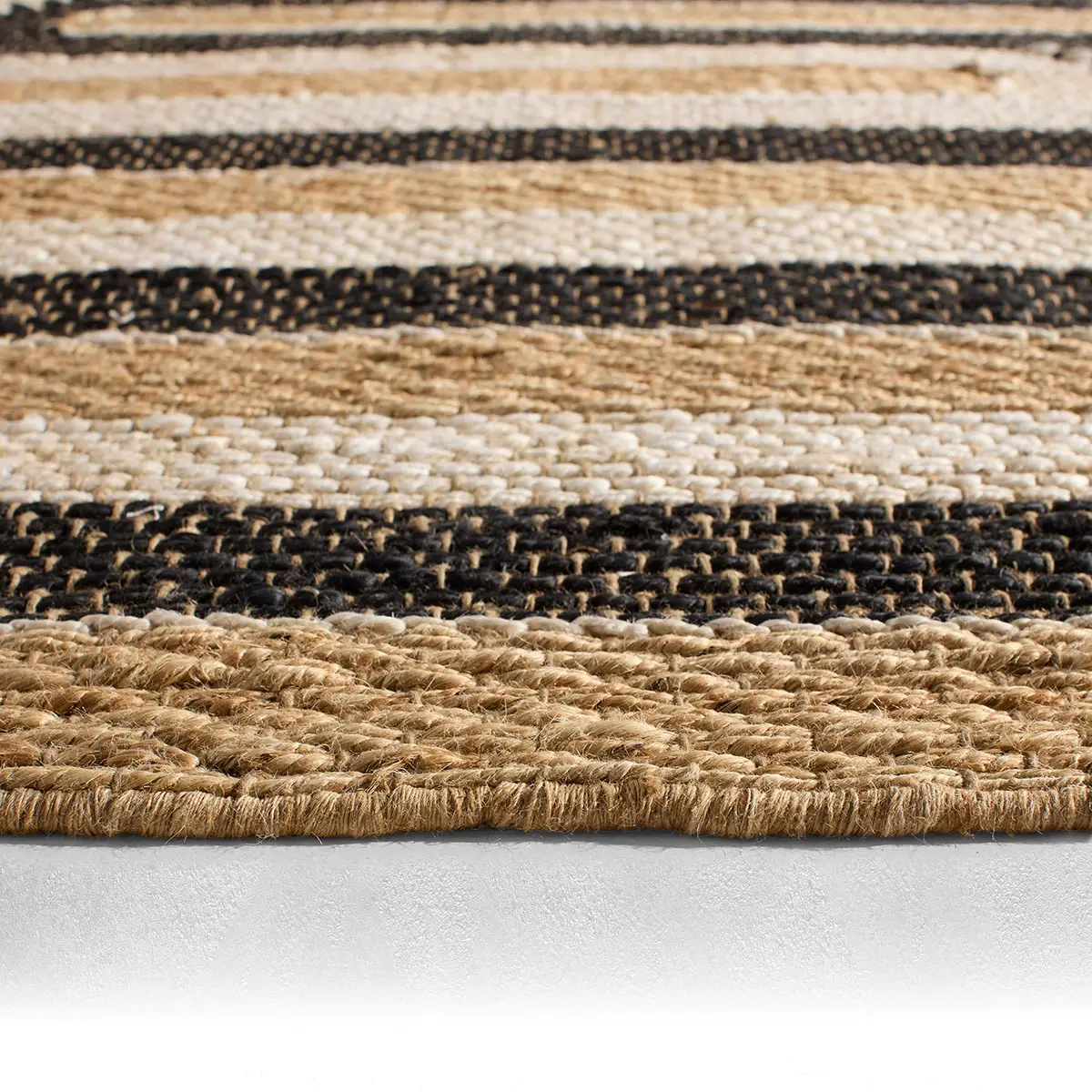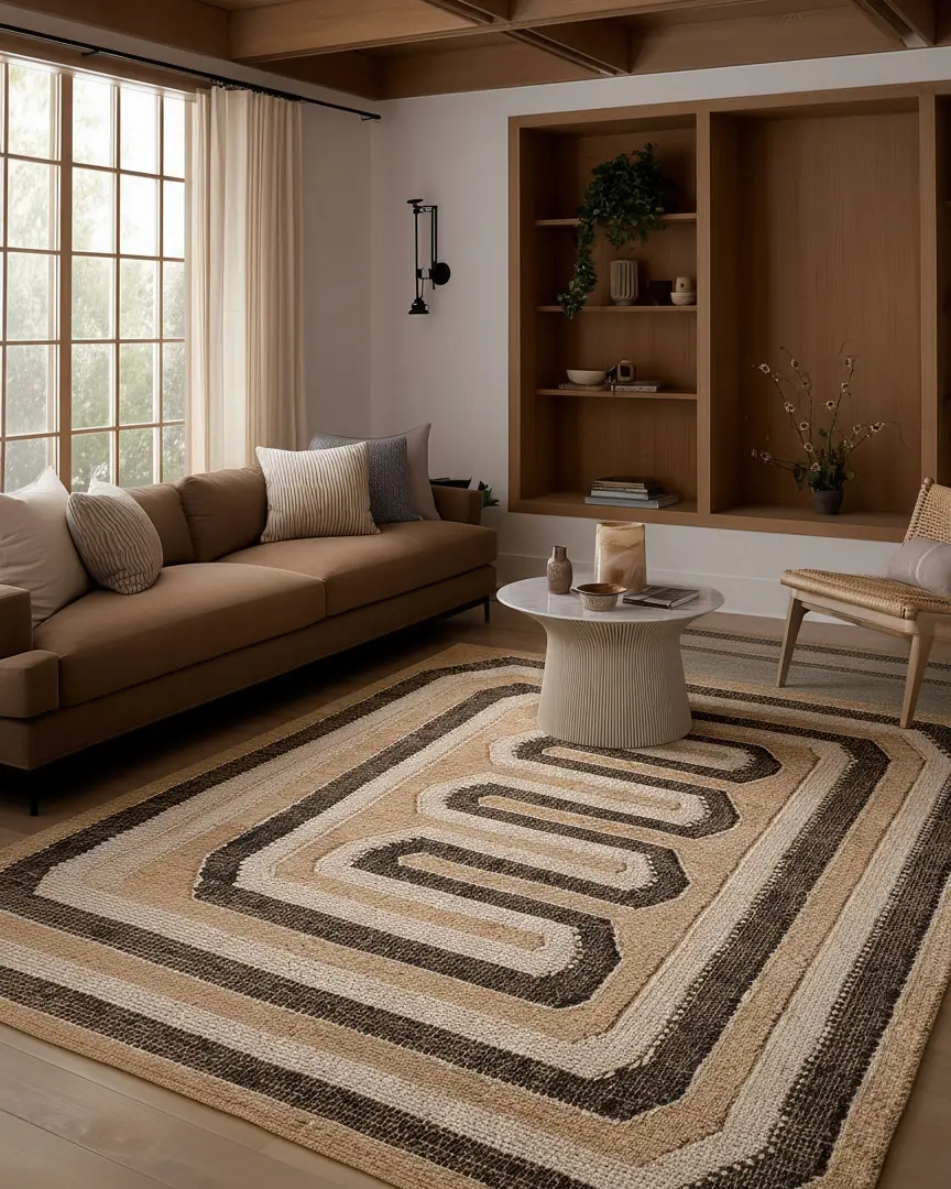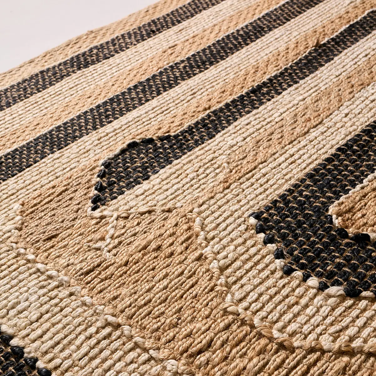 A serpent labyrinth is what jute dreams are made of. The design masterfully blends minimalism with primitivism, handwoven by artisans with sustainable jute. Its inviting textural pile features a captivating geometric snake motif in rich Tan-Beige and Black tones, creating a compelling statement for any home.